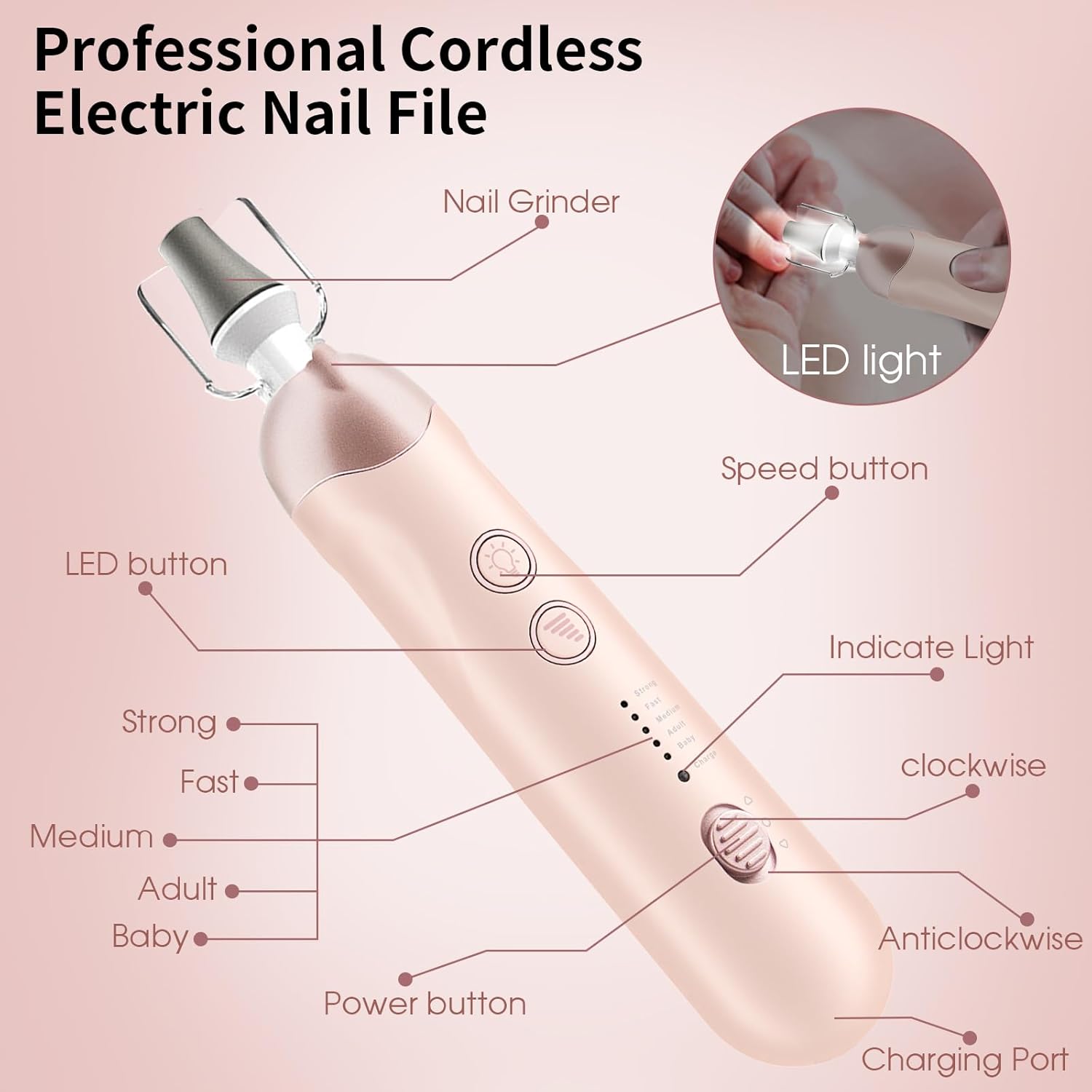 Professional Manicure Pedicure Kit, Cordless Electric Nail File Set, Rechargeable Pedicure Tools for feet, 5 Speeds Hand Foot Care Nail Drill for Thick Nail Toenail Cuticle Women Men Baby Pets-Rose