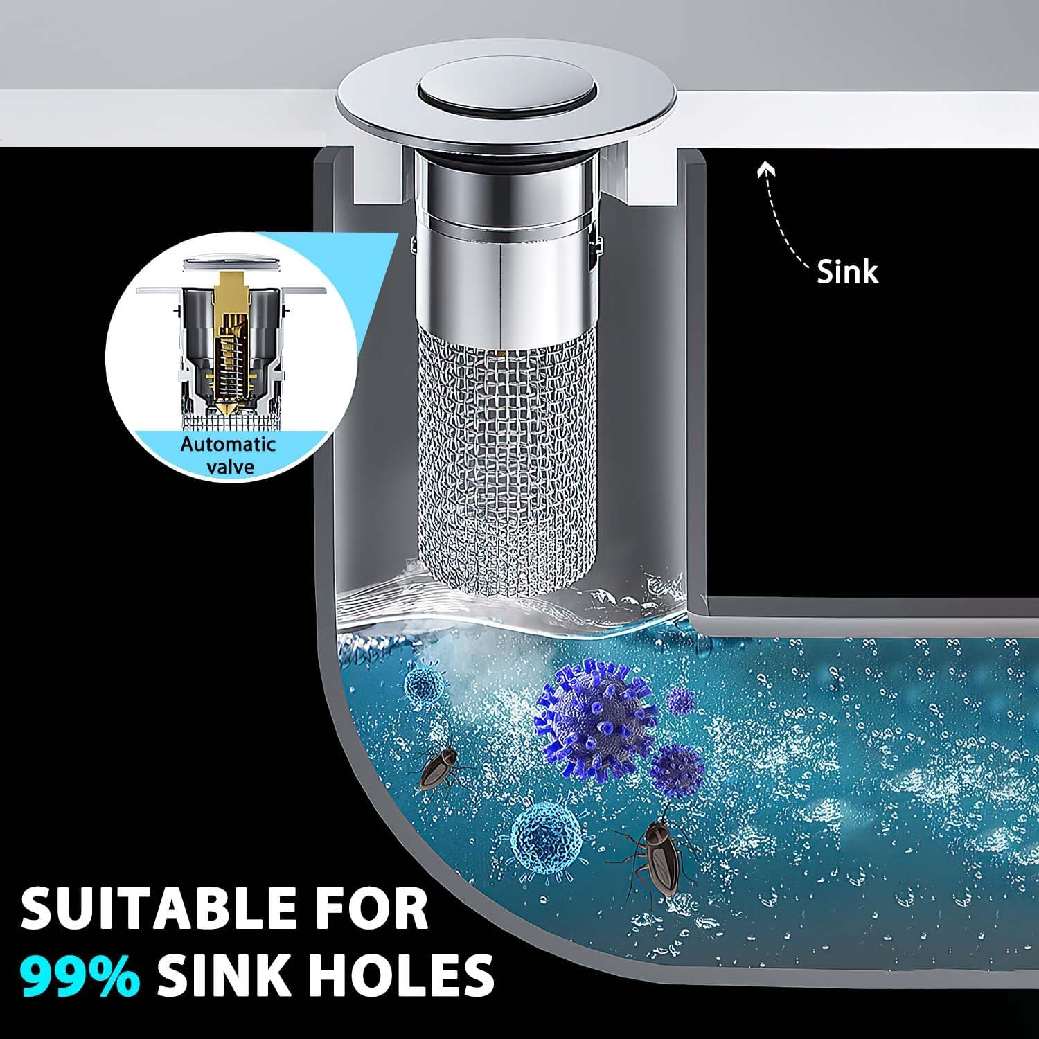 - 【2 in 1 Upgraded Function】- Upgraded Pop-up Bathroom Sink Stopper has an Removable Filter Basket, innovative design cleverly will sink pop-up stopper and sink strainer made in one that collects hairs and prevents the drain from clogging, or prevents valuables such as rings that are prone to slipping from falling into the sewer. Easy removal when harmful materials enter the stopper, simply pull the drain out and remove harmful particulates from the strainers