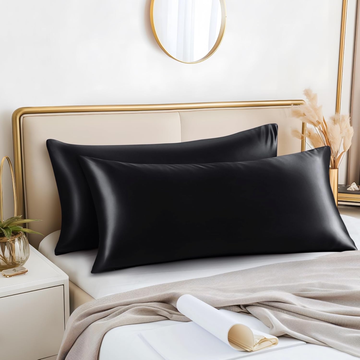 BEDELITE Satin Body Pillow Cover 2 Pack, Super Soft and Cooling Body Pillow Pillowcase for Hair and Skin, Breathable Silky Full Long Pillowcase Cover(20"x54", Black)