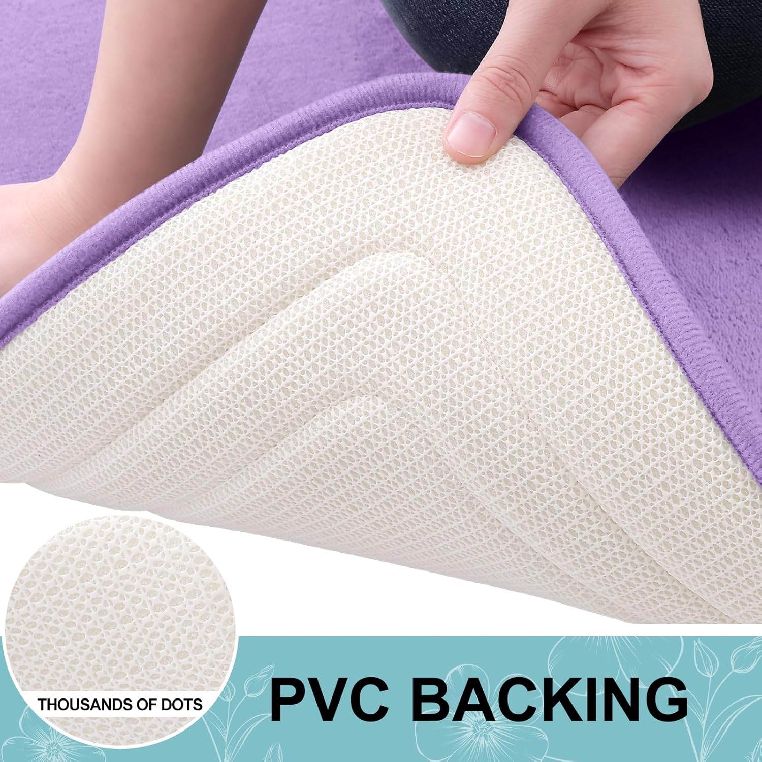 - [STABLE FOOTING] Our bathroom mat is equipped with a robust and enduring PVC backing, preventing shifting and skidding. Unlike mats with rubber backing that may wear off after washing, our bath mat ensures lasting durability. For a secure footing, keep the floor beneath the rug dry and avoid placing it on wet surfaces.