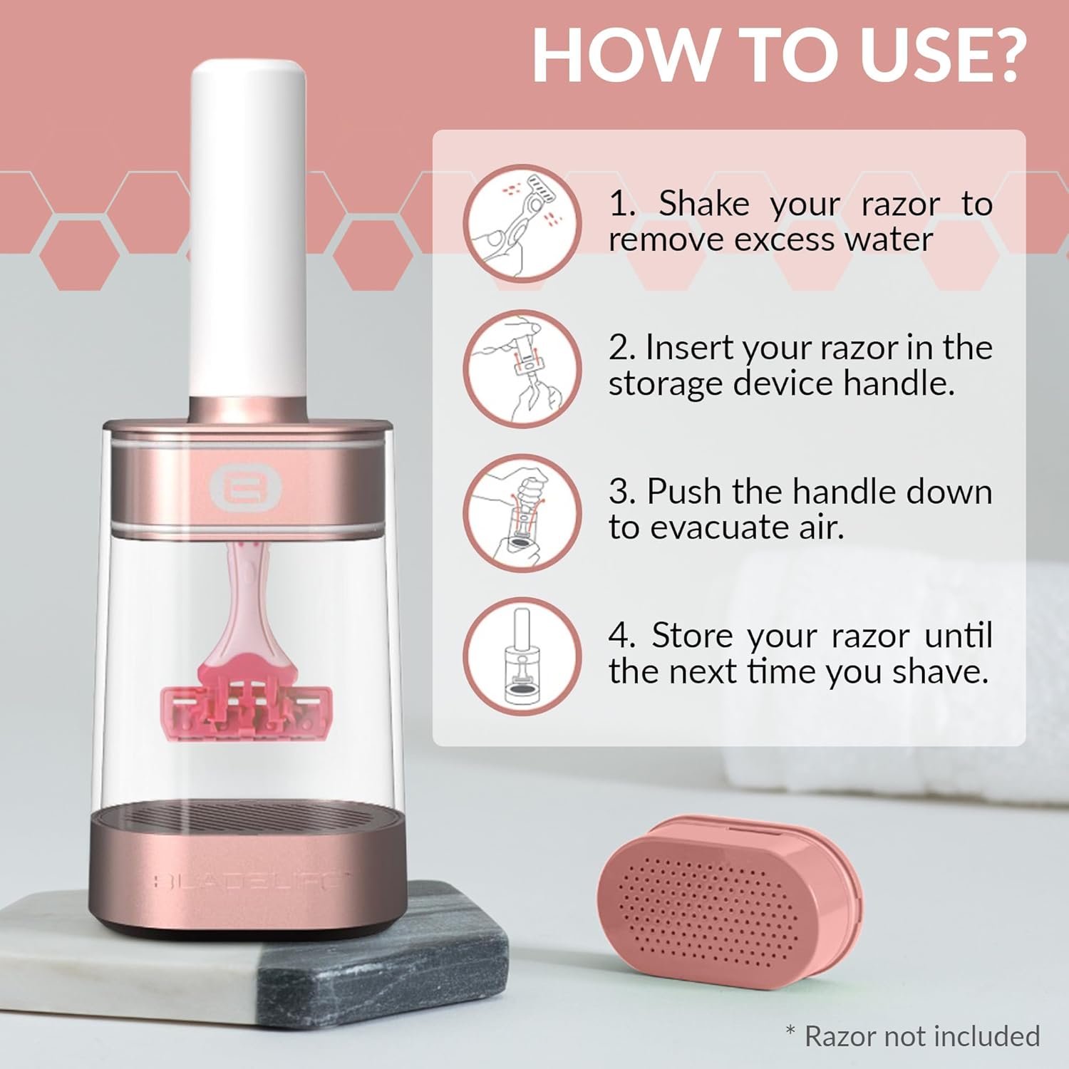 BLADELIFE Razor Storage Device for Women & Men Rose Gold - Fits All Leading Razors - Doubles The Life of Your Blade - Razor Travel Case 2024 New Model