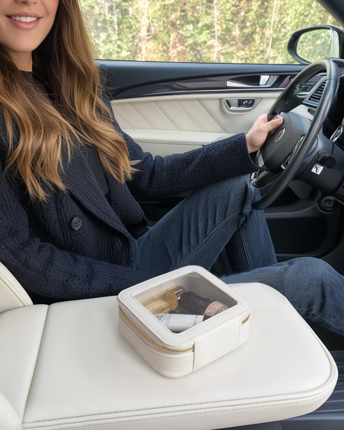 - Car Must Have Essential: Our car essentials small pouch travel toiletry bag is roomy to store your makeup brushes, lipstick, eyebrow pencil, make-up foundation, cables, chargersor and other little items.It make your daily make-up, cream, lipstick, perfume and other beauty things organized and protected.This clear mini toiletry bag can be a good car accessory fits in the center console or other parts of your car.