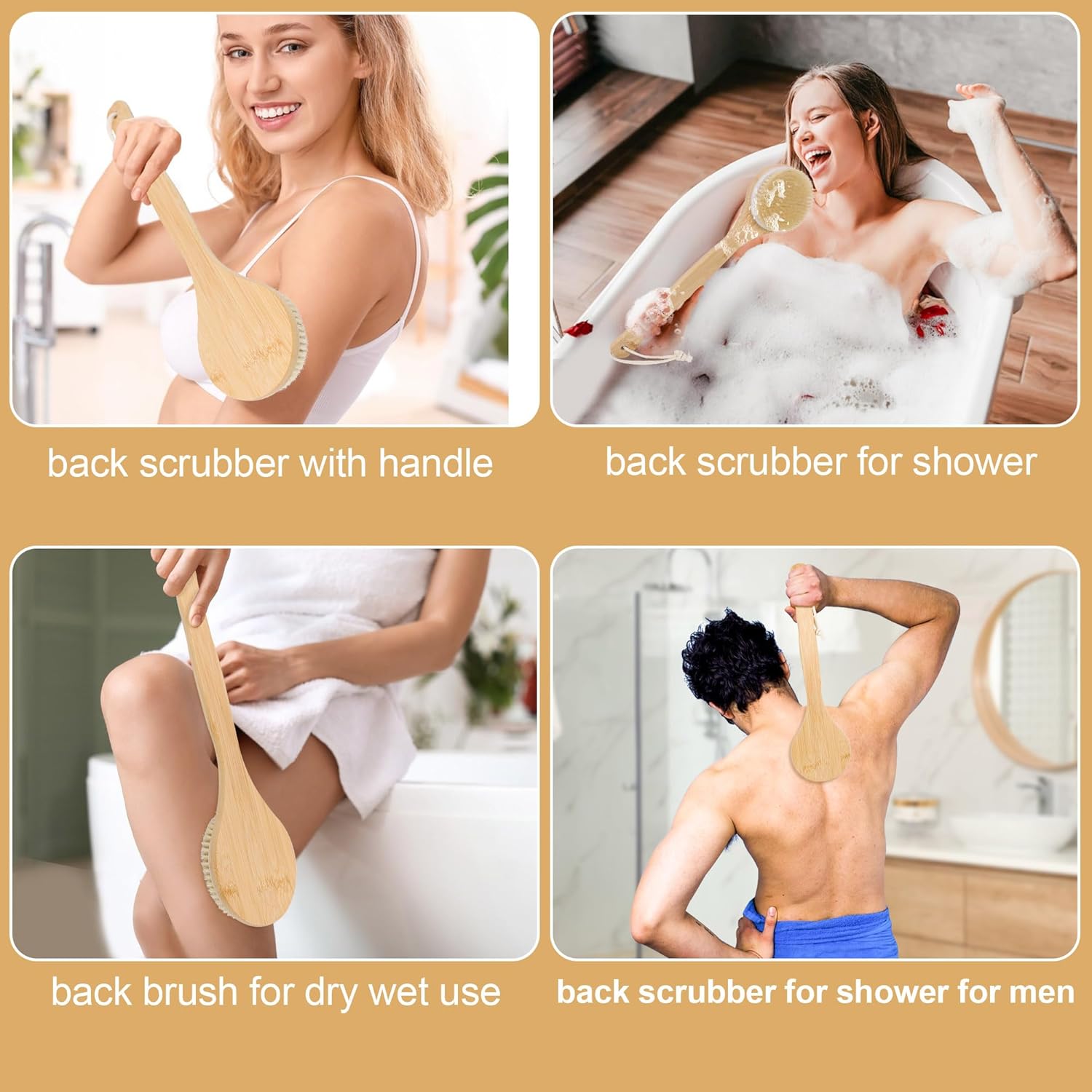 - Bamboo Long Handle Bath Brush: It has a long handle made of wood that is over 40 cm (15.7 inch) long, it is made of Natural Bamboo material, it is antiskid, moisture-proof, healthy and tasteless. It can be washed your back even all parts of the body easily. In addition, there is a hanging rope at the handle.