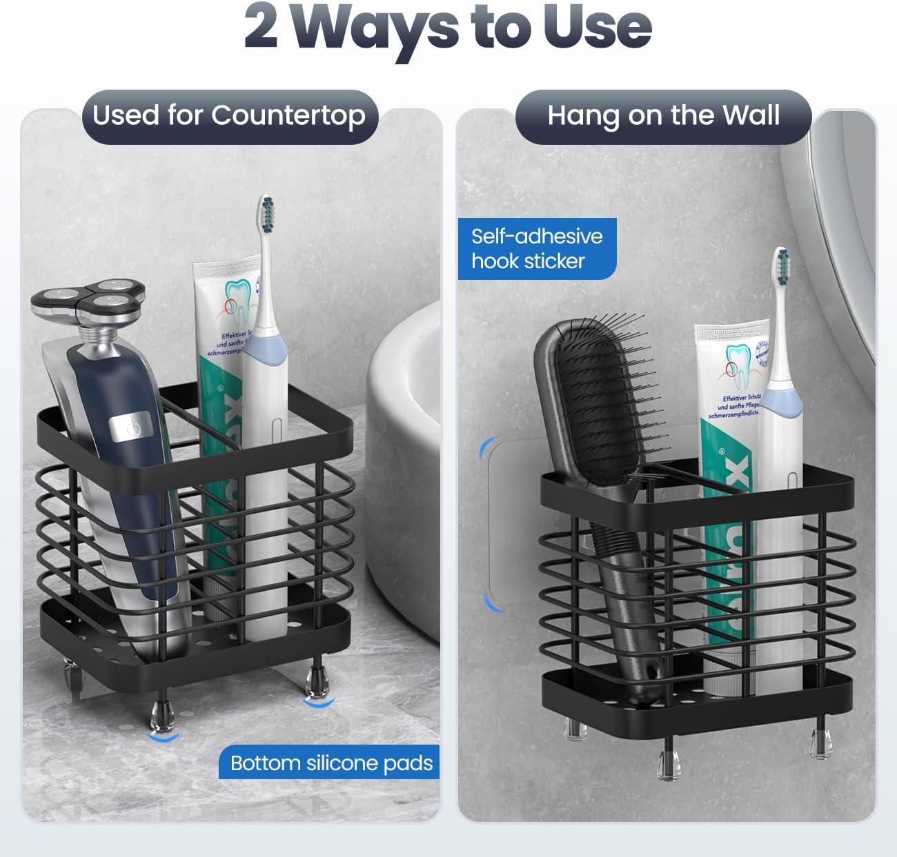 - Wall Mounted and Countertop Use: Our toothbrush holder is perfect for both wall-mounted and countertop use. With an adhesive hook, it effortlessly adheres to any smooth wall surface (suitable for tile, marble, glass, or metal), requiring no drilling and leaving no damage to your walls. And when you prefer countertop use, the silicone pads on the base of toothbrush holder ensure stability and prevent scratching the countertop.