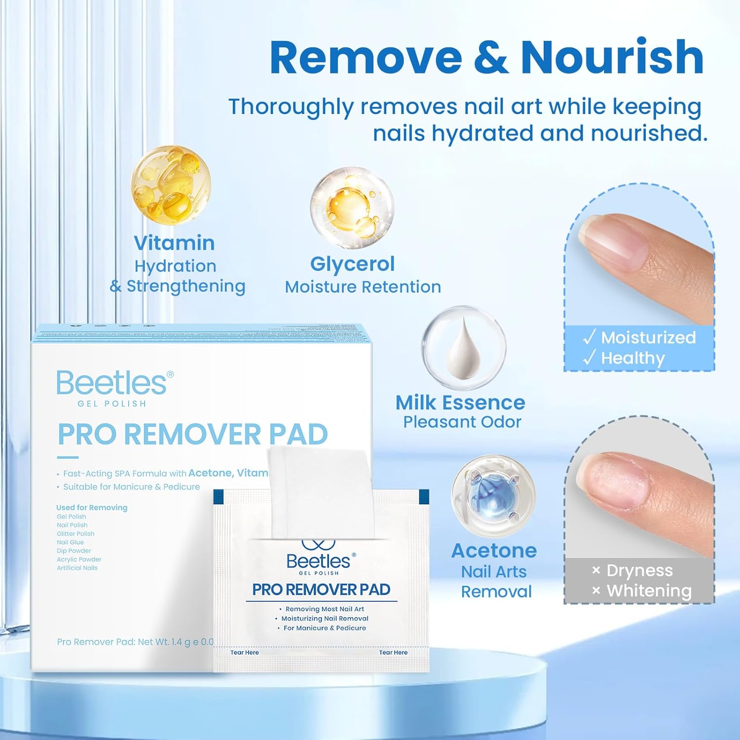 - Extra-Large Pads for Hands & Feet: Bigger than standard pads, Beetles nail polish remover pads are ideal for both manicures and pedicures—even long or artificial nails. One pad easily wraps around fingernails and toenails.