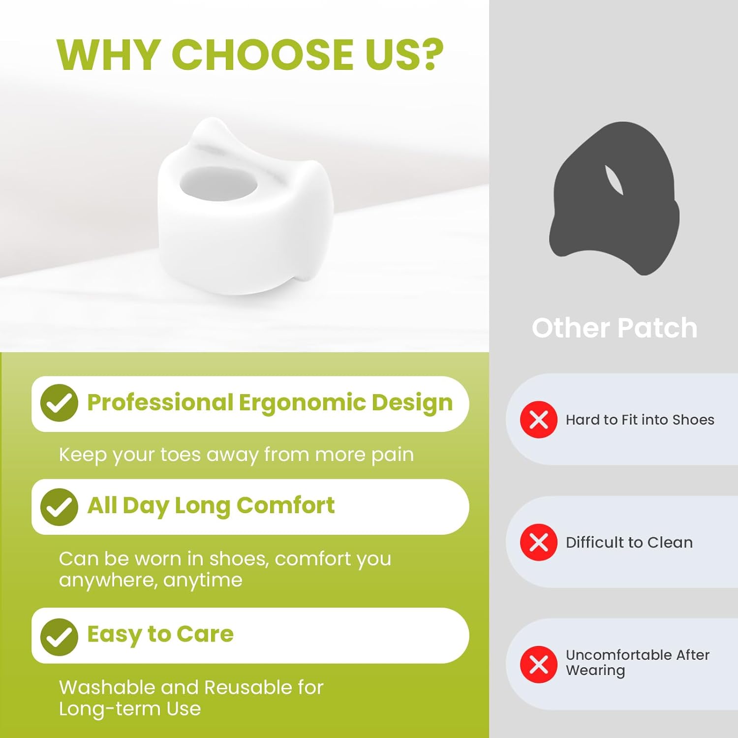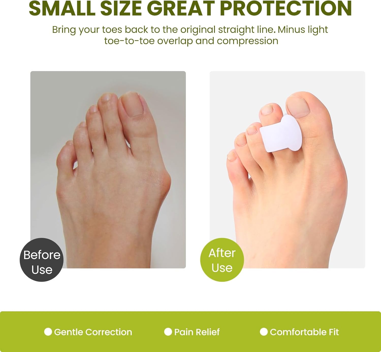 - Advanced Pain Relief -- Our silicone toe separators are designed to alleviate discomfort caused by bunions, overlapping toes, hammer toes, drifting toes, curled toes, and rubbing toe pain. Experience relief and improved foot health with every wear.