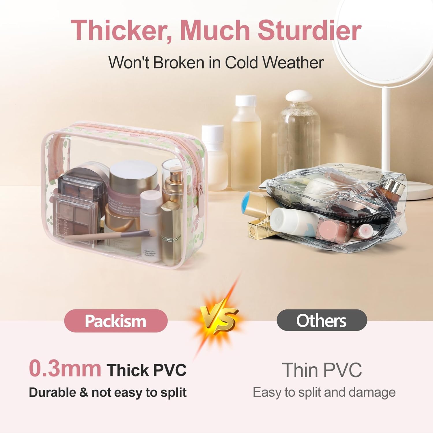 PACKISM TSA Approved Toiletry Bag - Pink Floral Print Clear Travel Bags, Suitable for Gifts, with Supporting Frame, Perfect for Travel Essentials, Thick No Smell