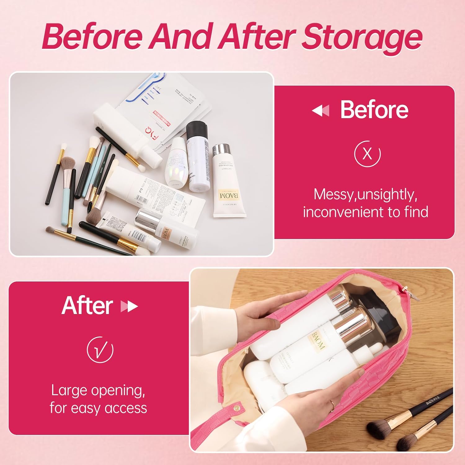 • Smart Multi Functional Design:Functions as both a cosmetic organizer and toiletry bag. Ideal for daily use, vacations, or business trips - keeps makeup, brushes, and skincare products neatly separated