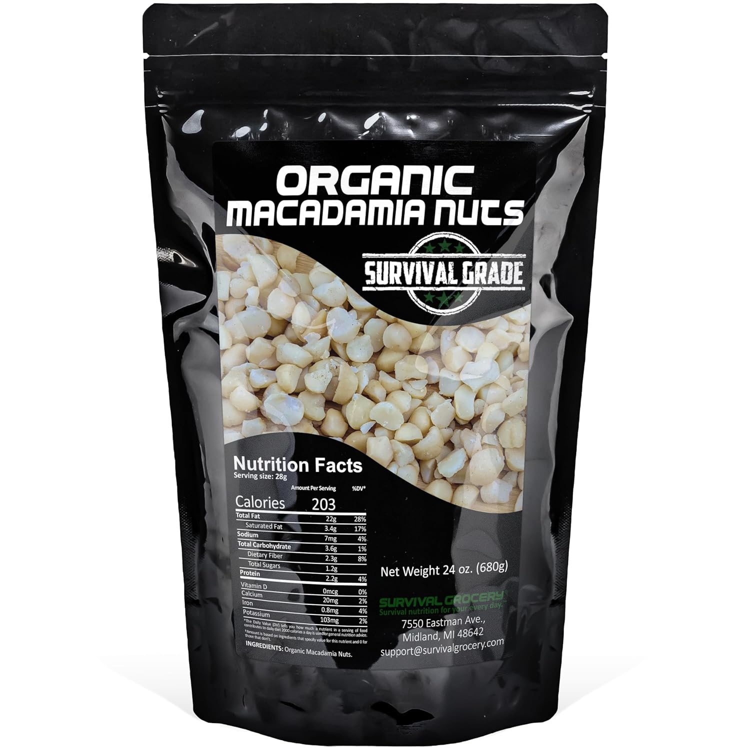 Survival Grocery® Organic Macadamia Nuts – Keto-Friendly Healthy Fats & Plant Protein, Oxygen- & Light-Barrier Packaging + O₂ & Moisture Packs, (Single or Multi-Pack Savings) (24 oz./1 Bag)