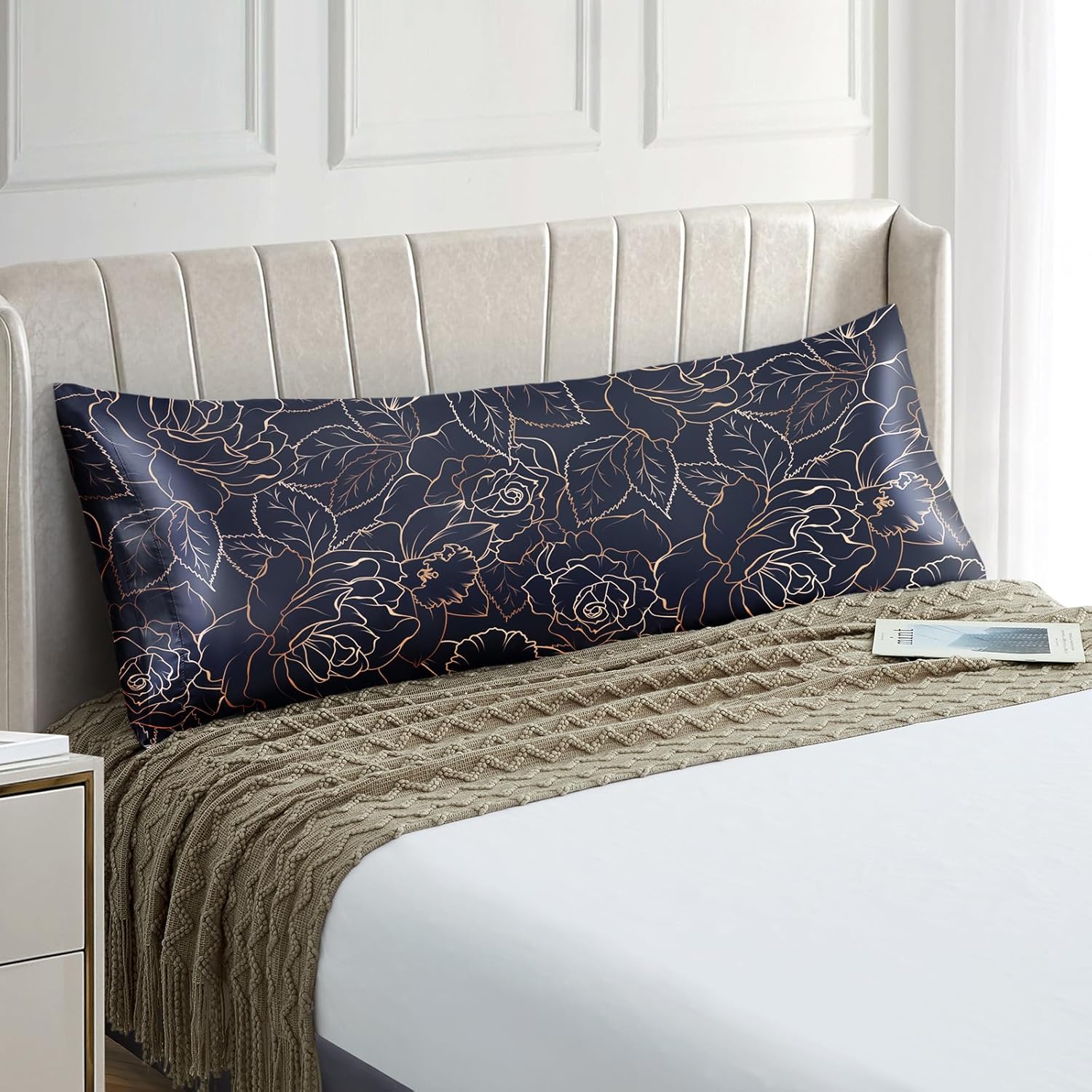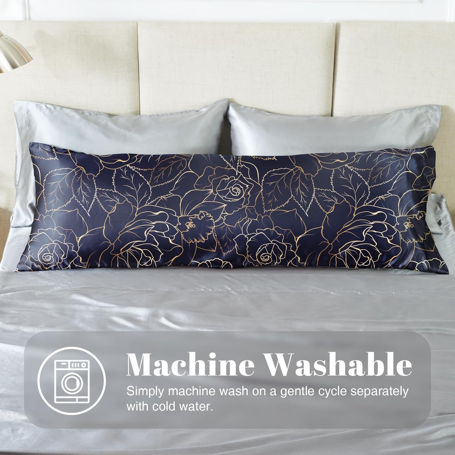 EXQ Home Satin Body Pillowcase for Hair and Skin- Rose on Blue Silk Long Pillowcase 20x54 inches - Satin Pillow Cases with Envelope Closure, Gifts for Women