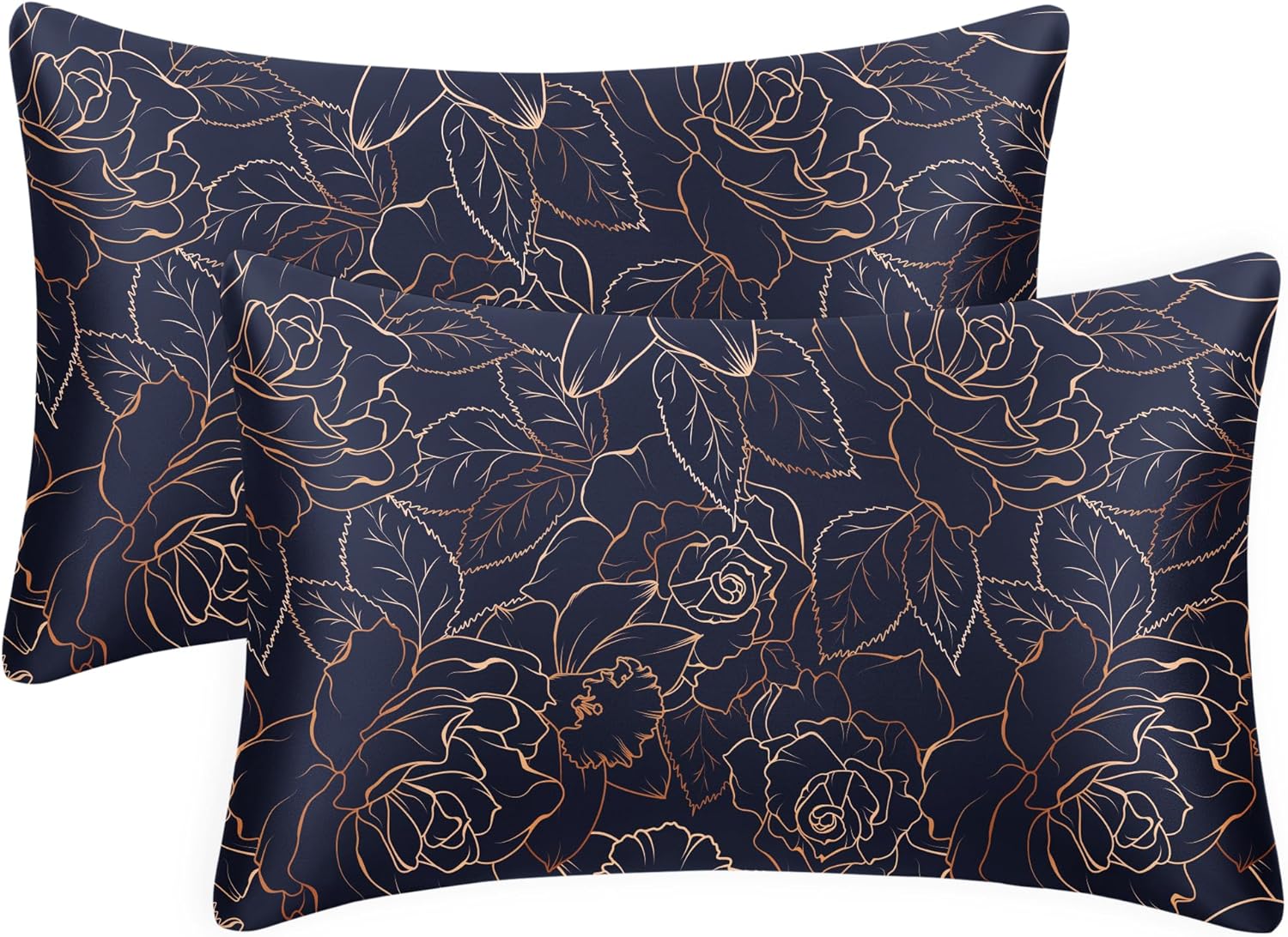 EXQ Home Satin Pillowcase for Hair and Skin- Rose on Blue Silk Pillowcase 2 Pack 20x26 inches - Standard Size Pillow Cases with Envelope Closure, Gifts for Women