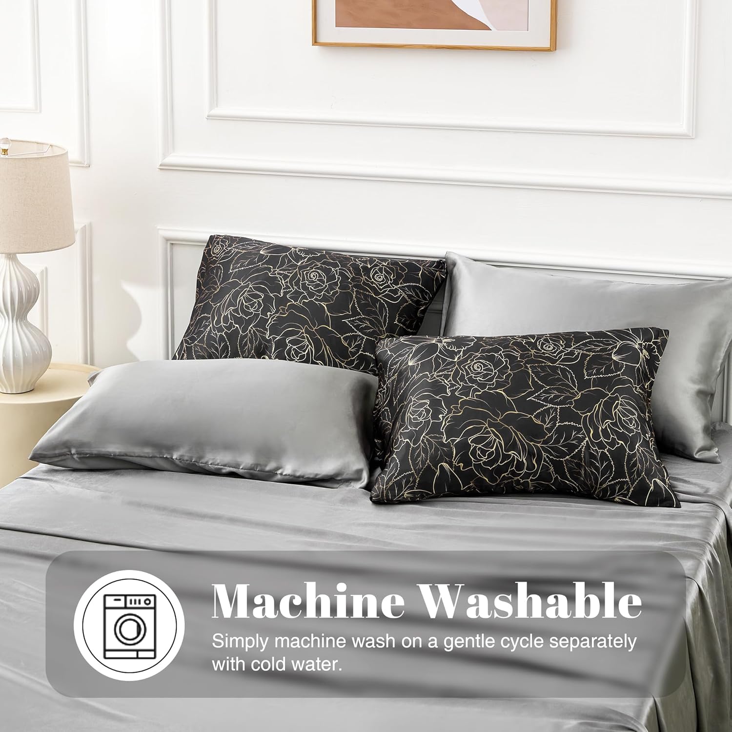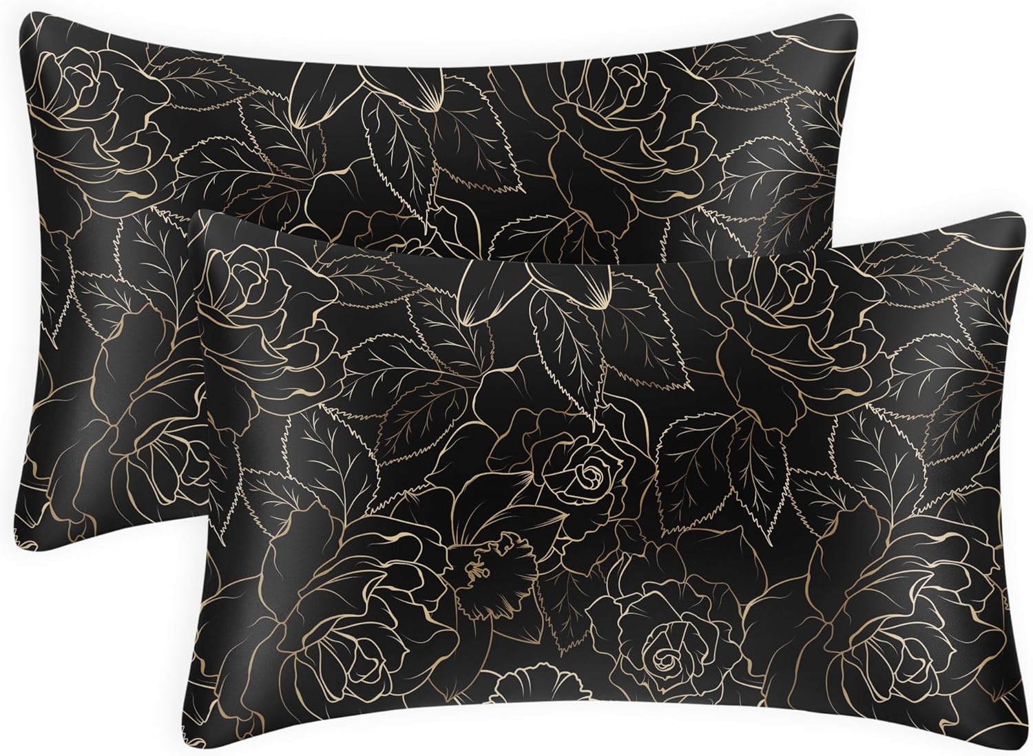 EXQ Home Satin Pillowcase for Hair and Skin- Rose on Black Silk Pillowcase 2 Pack 20x40 inches - King Size Pillow Cases with Envelope Closure, Gifts for Women
