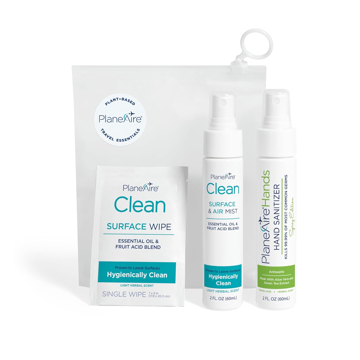 - 1-2-3 CLEAN: Spray, Wipe and Clean! Our travel kit contains 1 PlaneAire Clean Surface & Air Mist, 1 Signature Herbal Spray of PlaneAire Hands and 6 individually wrapped PlaneAire Clean surface wipes.