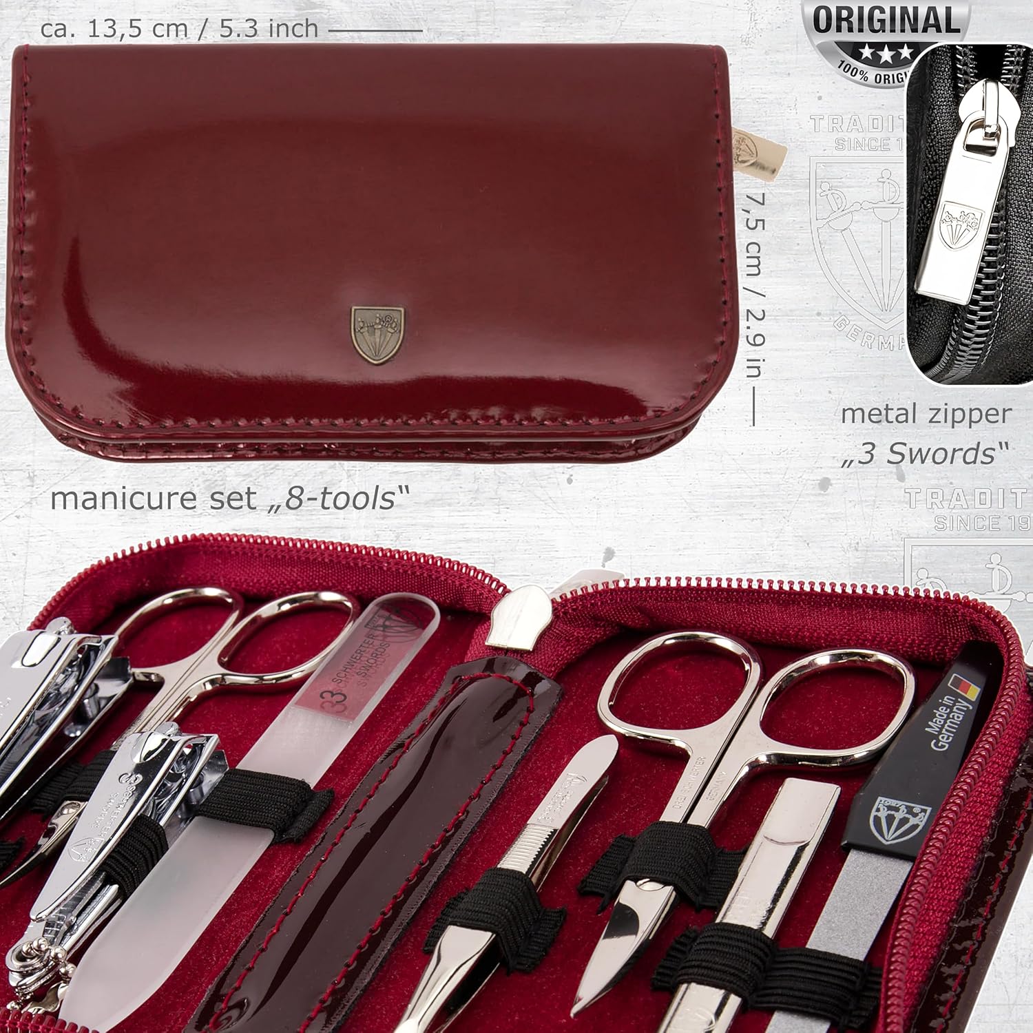 3 Swords Germany - brand quality 8 piece manicure pedicure grooming kit set synthetic leather case shiny burgundy - Made in Germany