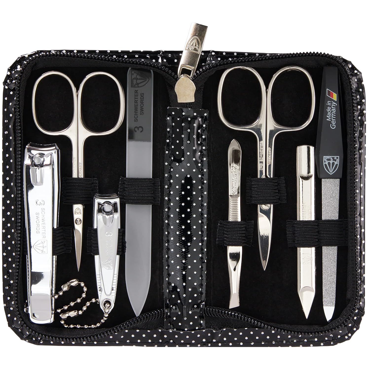 3 Swords Germany - brand quality 8 piece manicure pedicure grooming kit set synthetic leather case black silver spots - Made in Germany