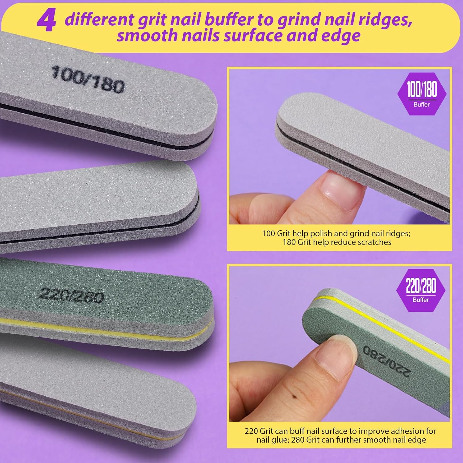 - 220/280 & 100/180 Grit Nail Files: 100 Grit(blank side) is rough, help polish and grind nail ridges to make it flat, help remove grease from nails, 180 Grit(printed side) is fine, always help reduce scratches; 220 Grit(blank side) can buff nail surface and make it rough, improve adhesion and durability for gel nail polish and nail glue, 280 Grit(printed side) can further smooth nail edge