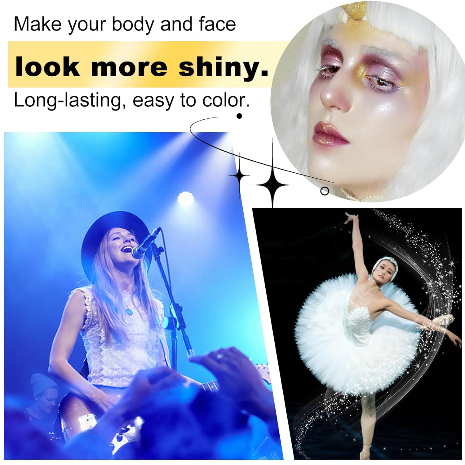 - ✦ EASY ON & EASY OFF -- Ideal for all skin types, it offers a quick-drying finish for instant luminosity, works as a body highlighter and gives your skin an elastic glossy glow. Apply with your hands or use a brush to evenly spread onto skin wherever you want to shape and highlight. When it's time to wash off, a little soap and water will do the trick, leaving your skin fresh and clean.