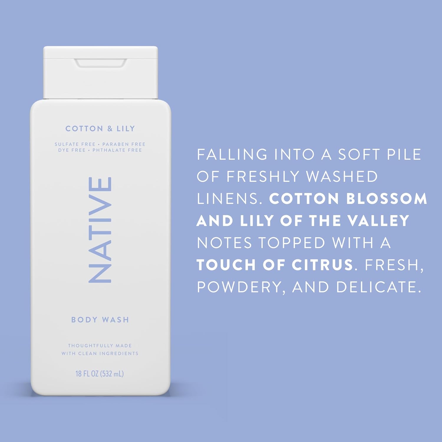 Native Body Wash Contains Naturally Derived Ingredients | For Women & Men, Sulfate, Paraben, & Dye Free Leaving Skin Soft and Hydrating | Cotton & Lily 18 oz - 2 Pk