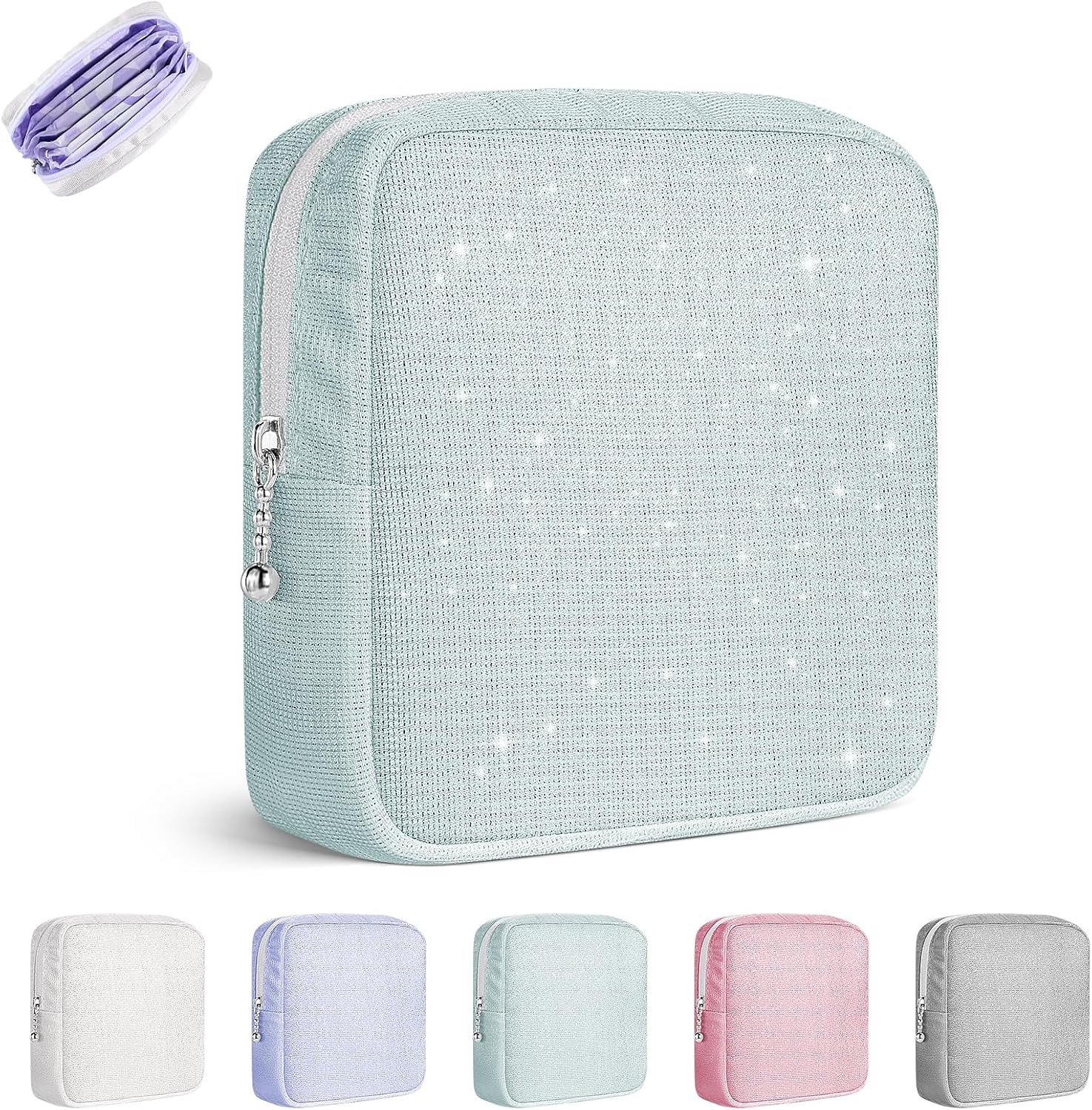 - 【Suitable Size】Measuring: 5.6*5.7*1.3 inches. Glitter sanitary napkin pouch can holds up to 10 normal size sanitary napkins and 4 tampons simultaneously. Whether you are at, office, outdoors or traveling, the sanitary pad pouch can easily fit in your bag