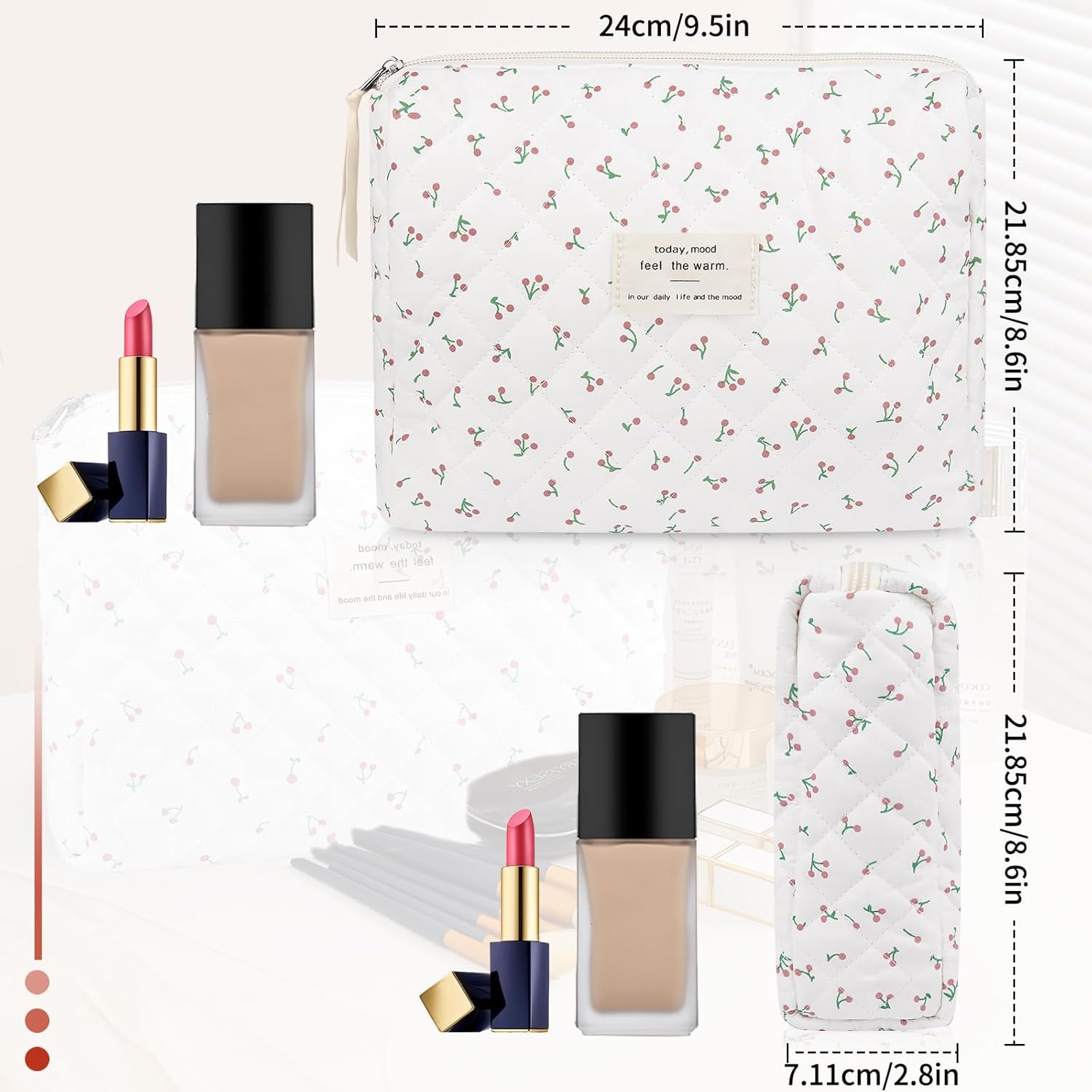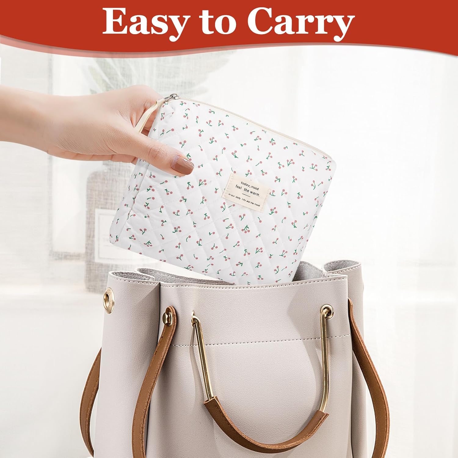 Floral Makeup Bag, Small Cosmetic Bag for Women Girls, Cute Cotton Makeup Bag, Quilted Makeup Bags, Flower Travel Toiletry Organizer Bag(White Cherry)