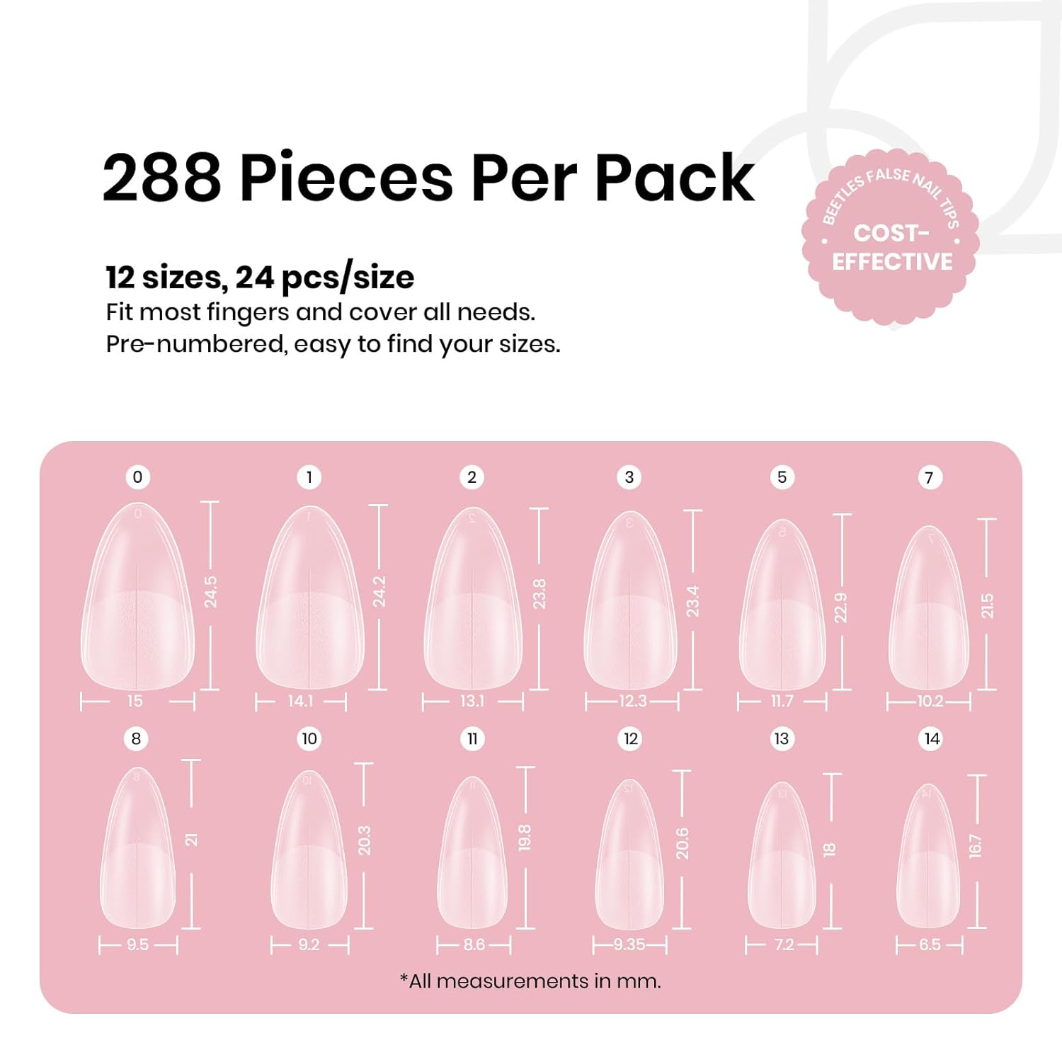Beetles Medium Almond Nail Tips: 288PCS Medium Almond Matte Clear False Acrylic Press on Nails Tips 12 Sizes Pre-shape Full Cover Nail Tips Nail Extension DIY Valentines Day Gifts for Women