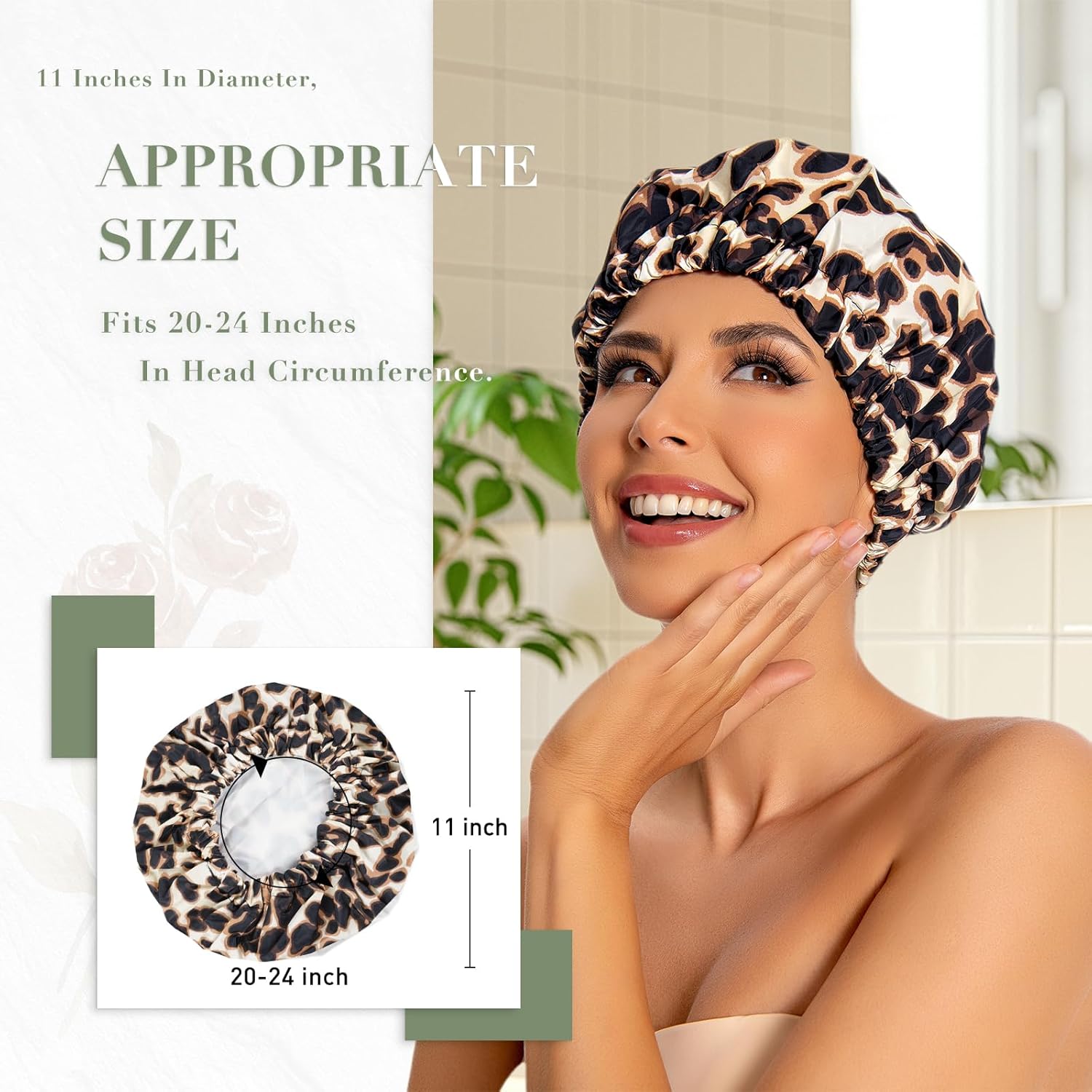 Reusable Shower Cap for Women, Large Waterproof Shower Essentials Bonnet Washable Elastic Band Bath Hair Wrap Hat for Long Hair, Braids(Leopard)