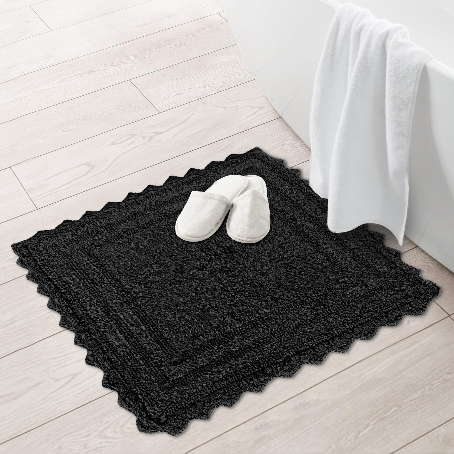 RAJRANG Black Cotton Bath Mat | 24 Inch Square Reversible Rug with Crochet Pattern for Bathroom, Spa, or Kitchen | Soft, Absorbent, Woven Boho Washable Floor Mat