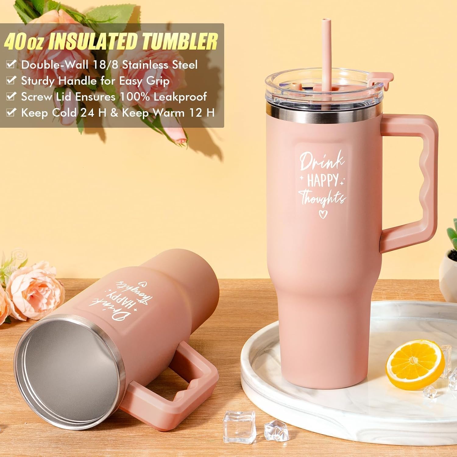 - 40 OZ TUMBLER WITH HANDLE & STRAW: Qinline insulated tumblers is crafted from premium 18/8 stainless steel, ensuring durability and resistant drops and rusts. It beverage temperature up to 24 hours for cold and 12 hours for hot. The screw lid and airtight seal make sure 100% leak-proof, With a comfortable handle designed for easy to grip and carry along. 40 OZ capacity is perfect for staying hydrated, drink all day along! The energetic quote "Drink Happy Thoughts" adds a motivational touch