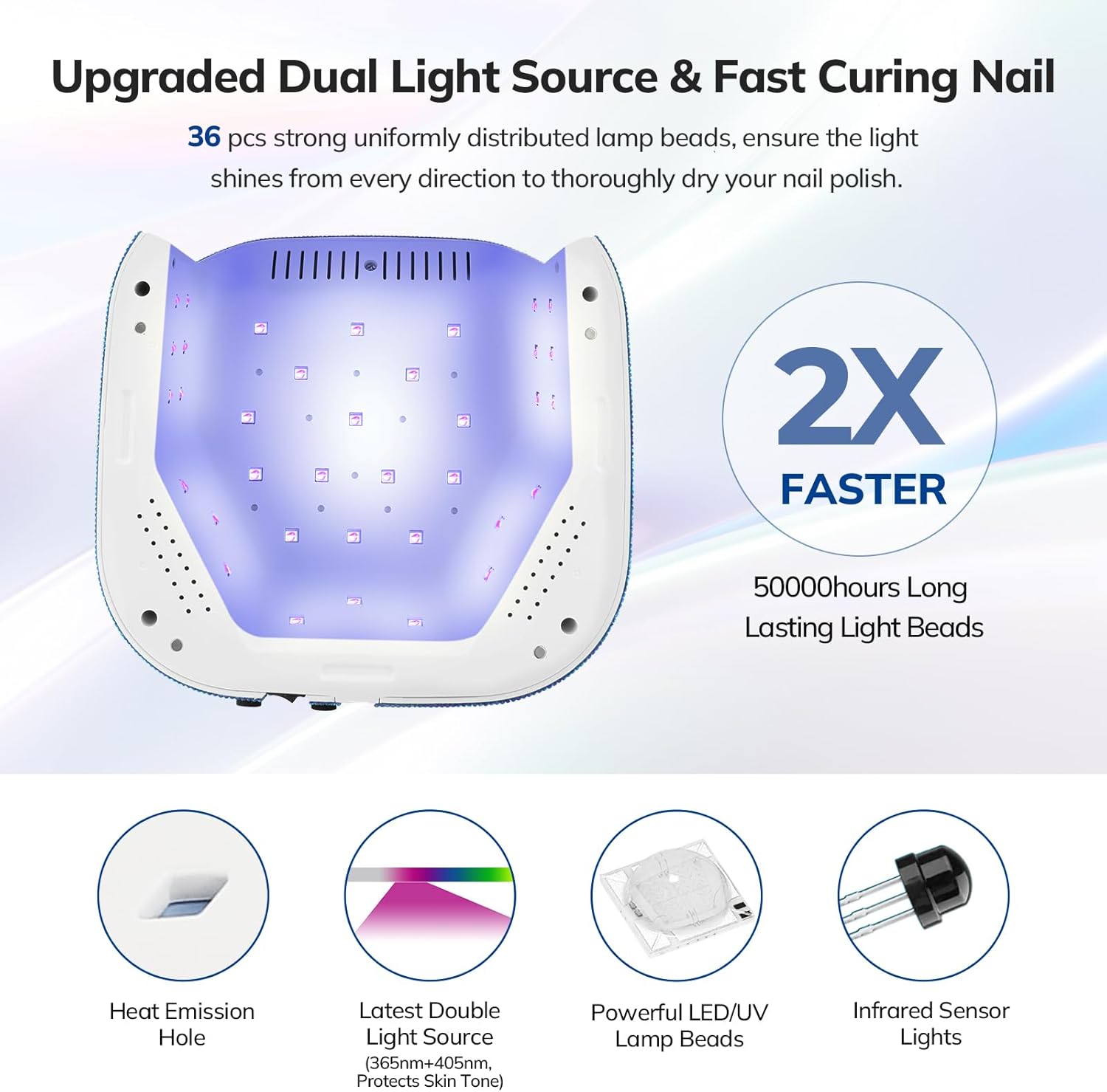 - 【Dual Light Source & Fast Curing Nail】Lavinda gel UV led lamp comes with 36pcs dual light source lamp beads, the light shines from all directions and dries nail polish quickly. And the light is soft (365+405nm) and not glaring which won't hurt your eyes and without tanning your hands. This flash cure lamp can fast dry all types of manicures and nail art.