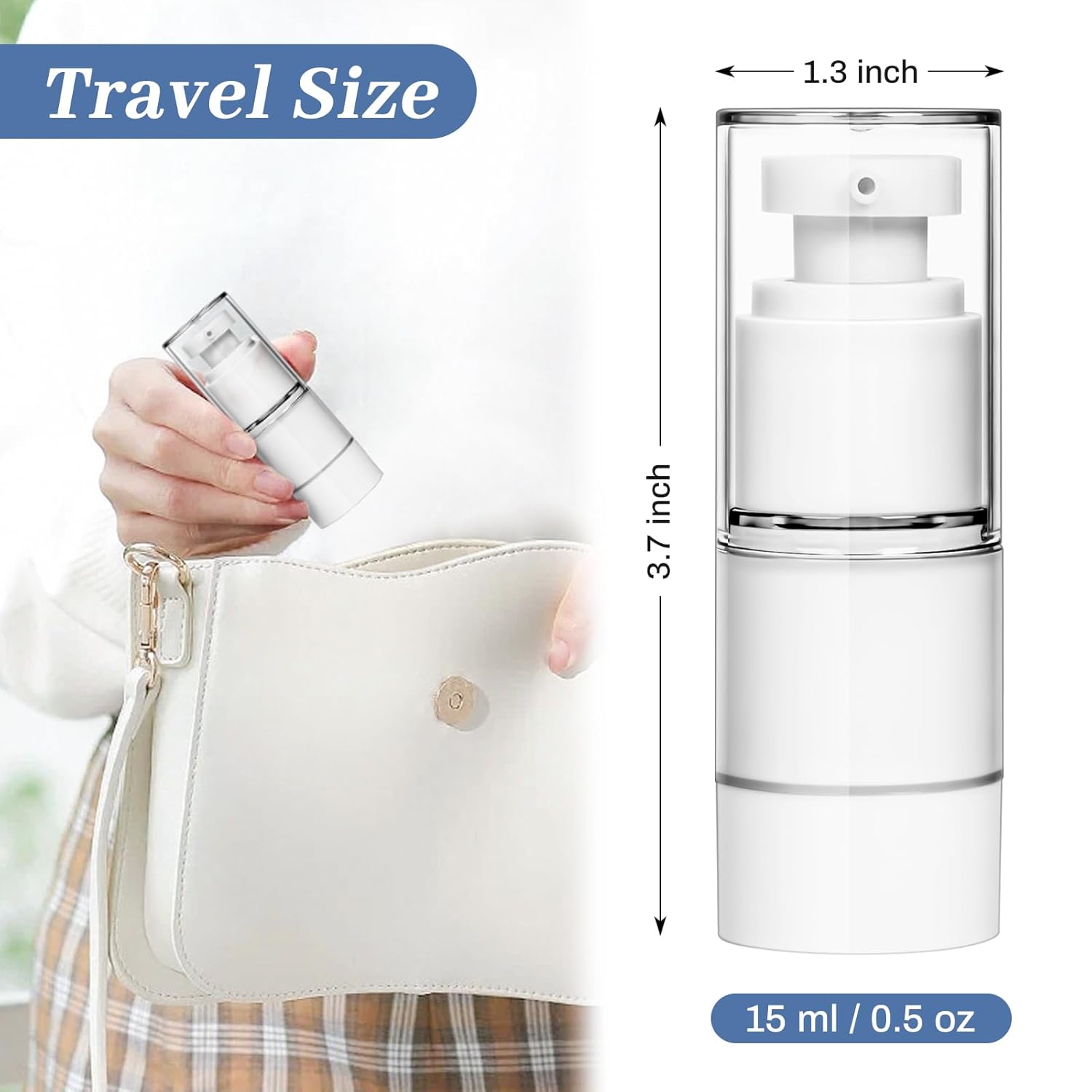- Value Pack: You will get 6pcs 15 ml/0.5 oz airless pump bottles with lids, each measures approx. 1.3" Φ x 3.7" H (33 mm x 95 mm), suitable for storing various types of cosmetics