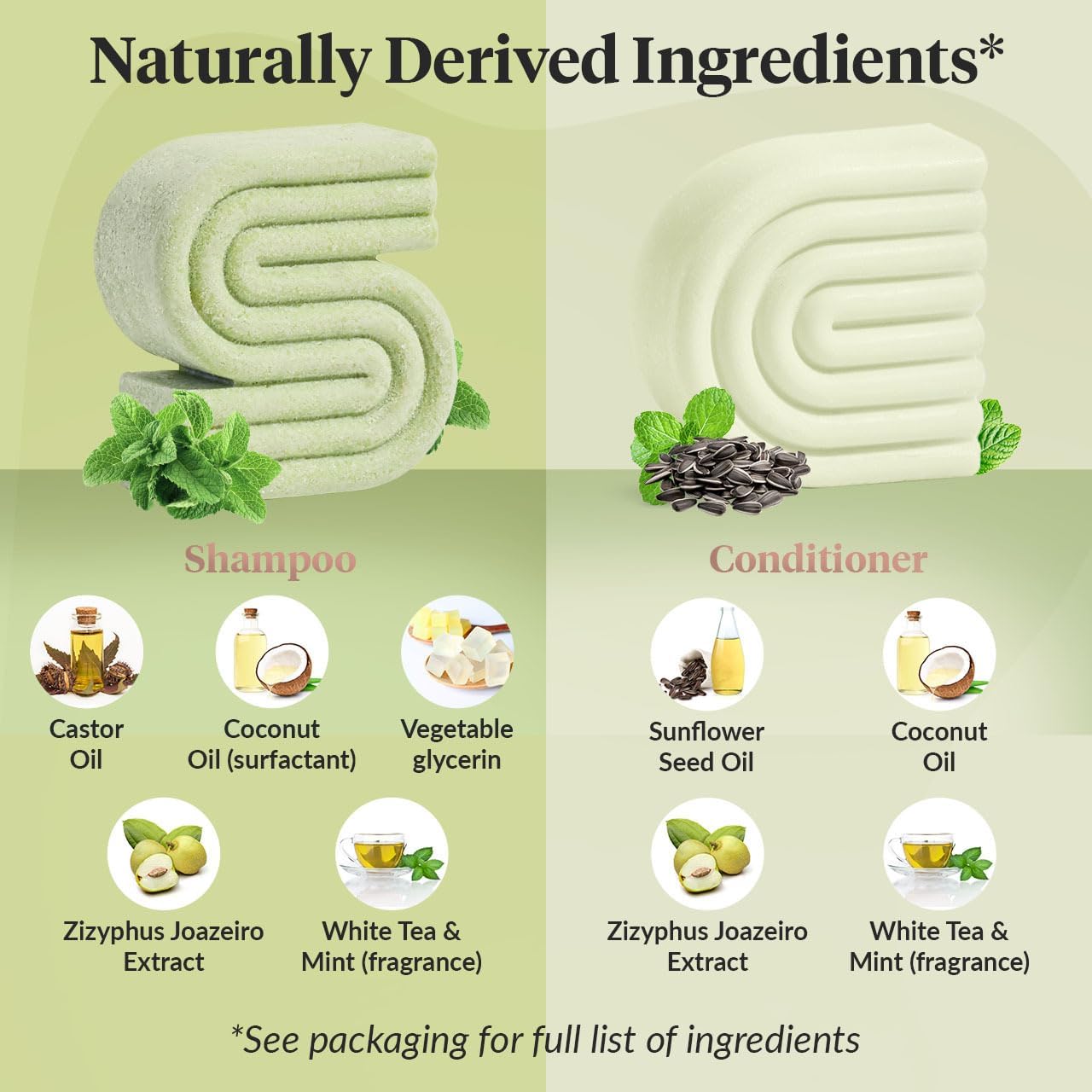 - TEA TREE & MINT HAIR CARE ROUTINE – The tea tree shampoo bar helps remove excess oil, while mint adds a cooling touch for a spa-like hair care experience at home. The matching conditioner bar delivers lightweight moisture, helping strands feel soft, nourished, and easy to detangle after each use.
