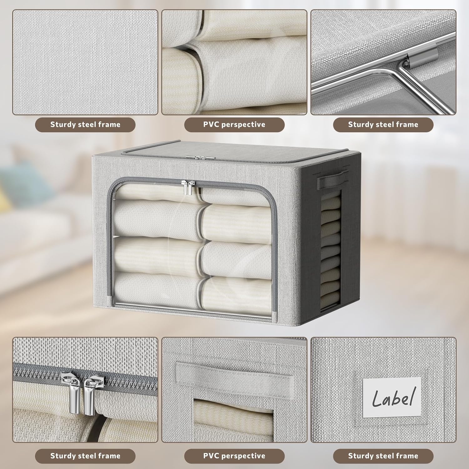 FHSQX 6 Pack Clothes Storage Bins with Metal Frame Foldable Storage Bins for Clothes Linen Fabric Storage Box with Clear Window (Light Grey, 19.7x15.7x13inch(66L))