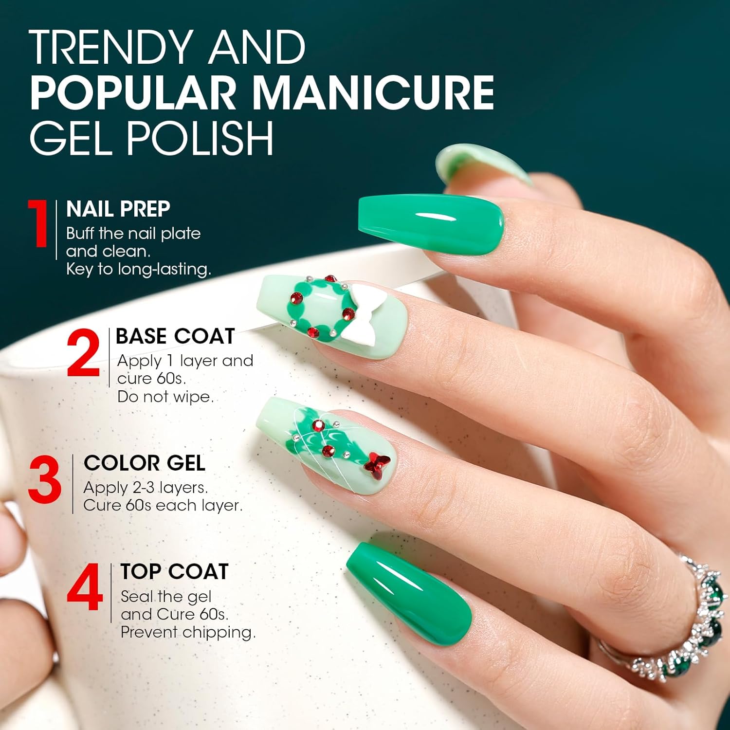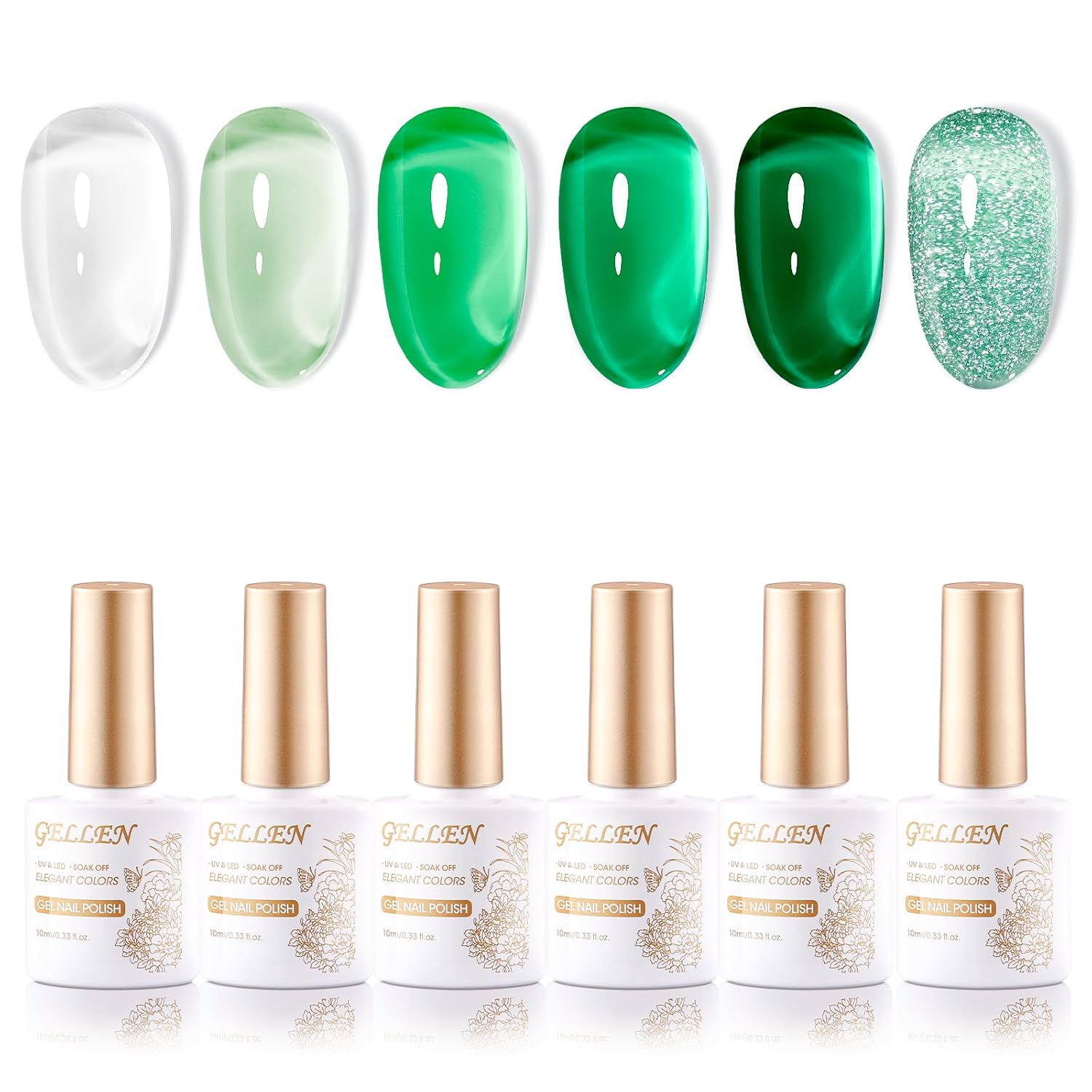 - Sheer Green Jelly Gel Nail Polish: We put the 6 most popular green colors together, and refer to the natural colors of emerald and jade, this is a noble and elegant gel nail polish set. You could display a colorful, stylish, modern manicure every time! It comes with the emerald green, jade green, glitter green, dark green, grass green and milky white jelly gel nail polish to DIY at home for christmas all seasons