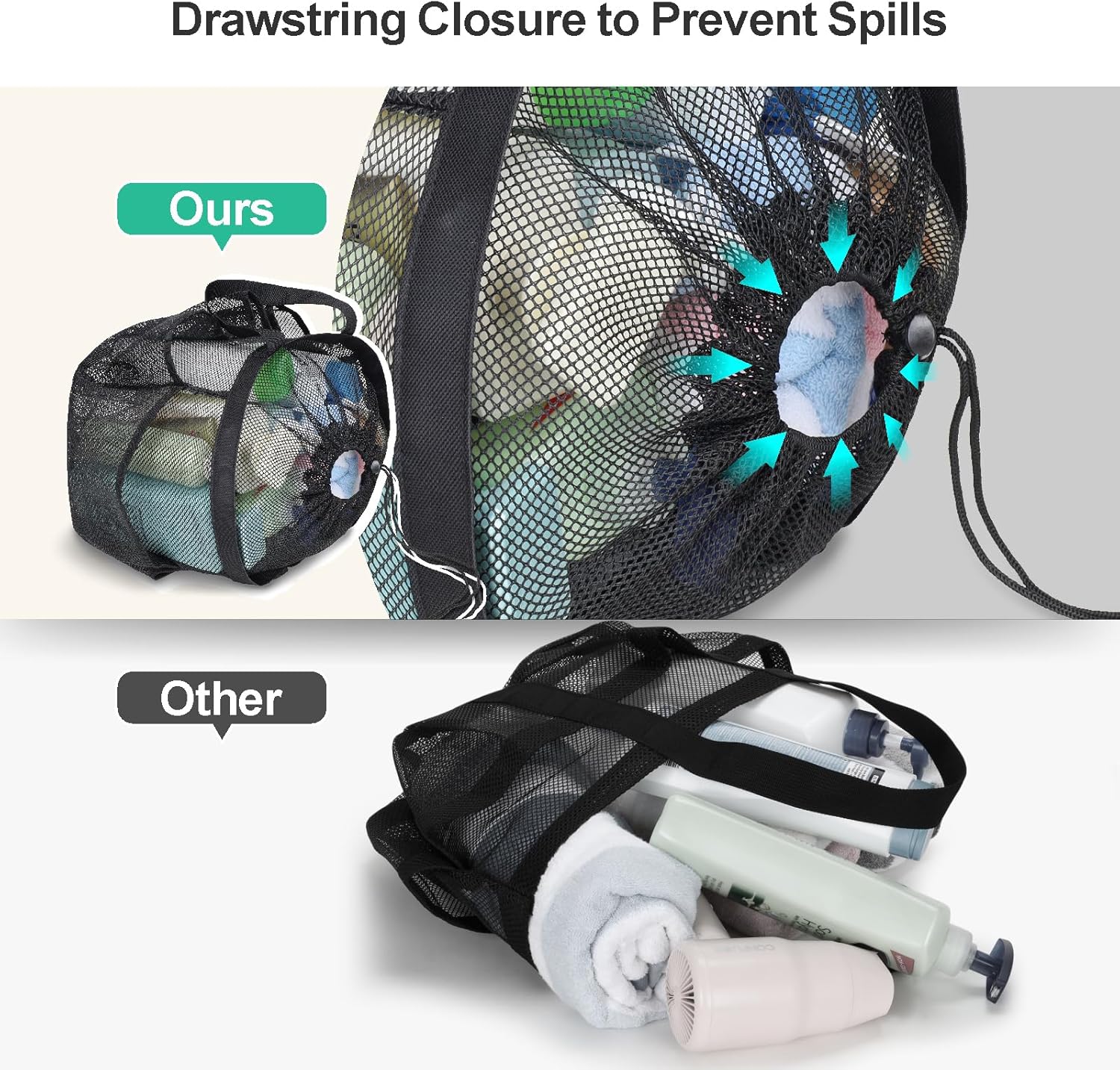 - 7 Upgraded Deep Pockets & Secure Drawstring for Peace of Mind: This shower tote bag features 7 upgraded exterior pockets with 7-inch depth, keeping tall bottles upright to prevent spills. A secure drawstring closure ensures toiletries stay safely inside—no more spills or lost items while you’re on the move
