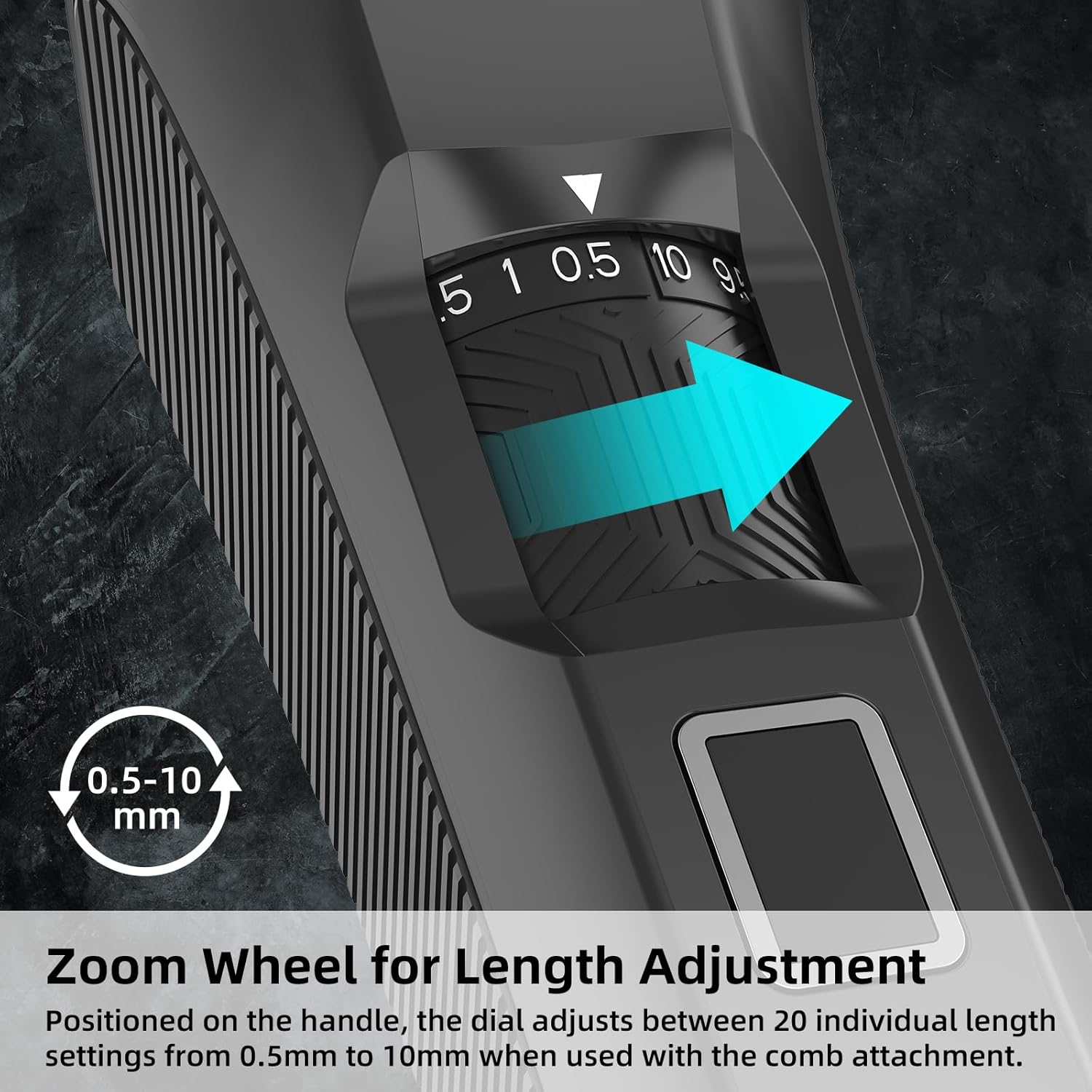 - LED Display & Travel Lock: Stay informed and in control with the advanced LED display that shows battery life and length settings at a glance. The professional beard trimmer for men has a built-in travel lock feature that prevents accidental activation, making it an excellent companion for travel. The rechargeable and cordless hair trimmer is designed for convenience, allowing you to maintain your grooming routine anywhere, anytime, without hassle.