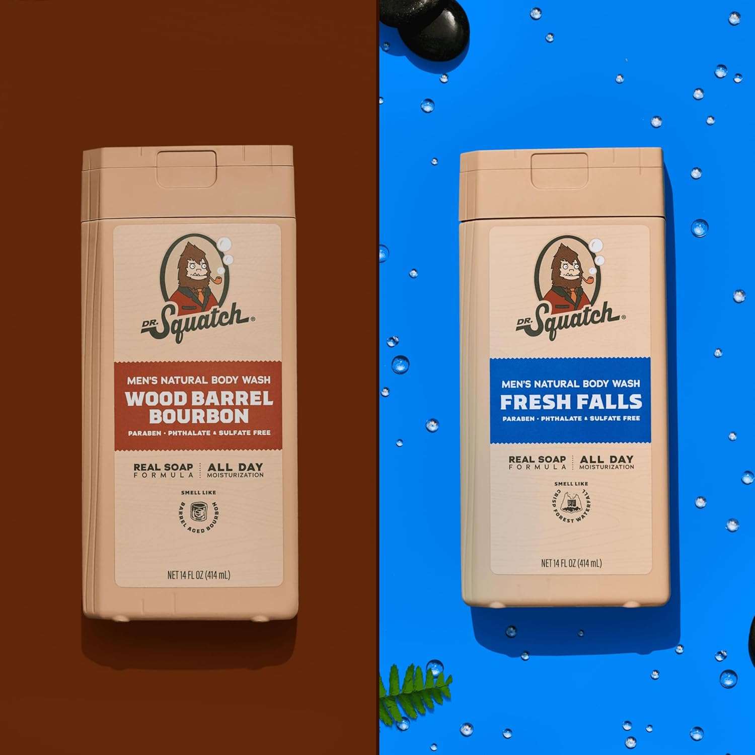 Dr. Squatch NEW Body Wash for Men with Nourishing, Natural Ingredients | No Paraben, Phthalate, Sulfate | All Day Moisture | Long Lasting Scent | Wood Barrel Bourbon & Fresh Falls (14 oz, 2-Pack)