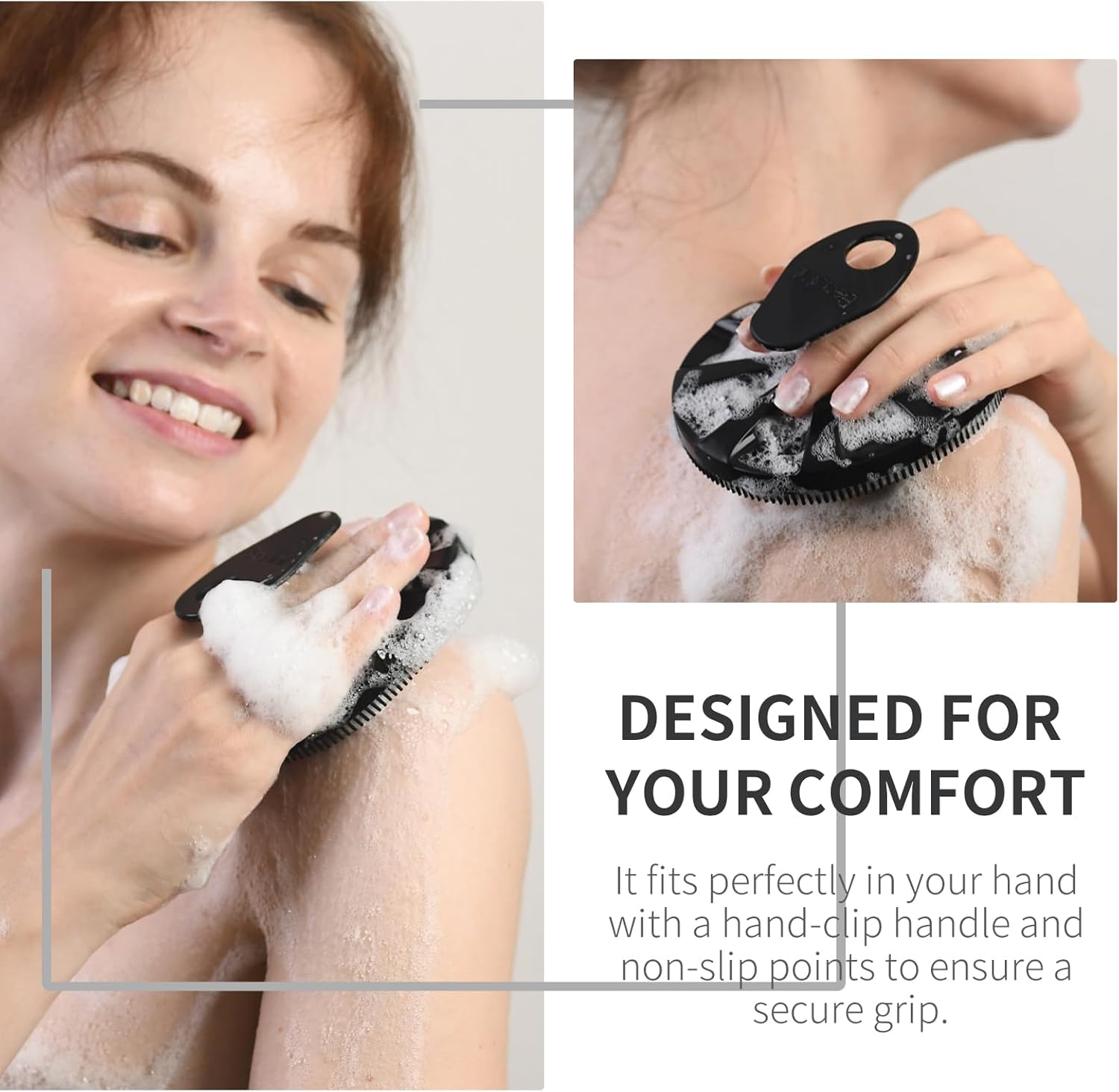 - EASY TO HOLD, NON-SLIP CONTROL: Designed for your comfort and convenience, our body scrub brush fits perfectly in your hand with a hand-clip handle and non-slip points, ensuring a secure grip. It also features a built-in hanging hole for effortless drying and storage.