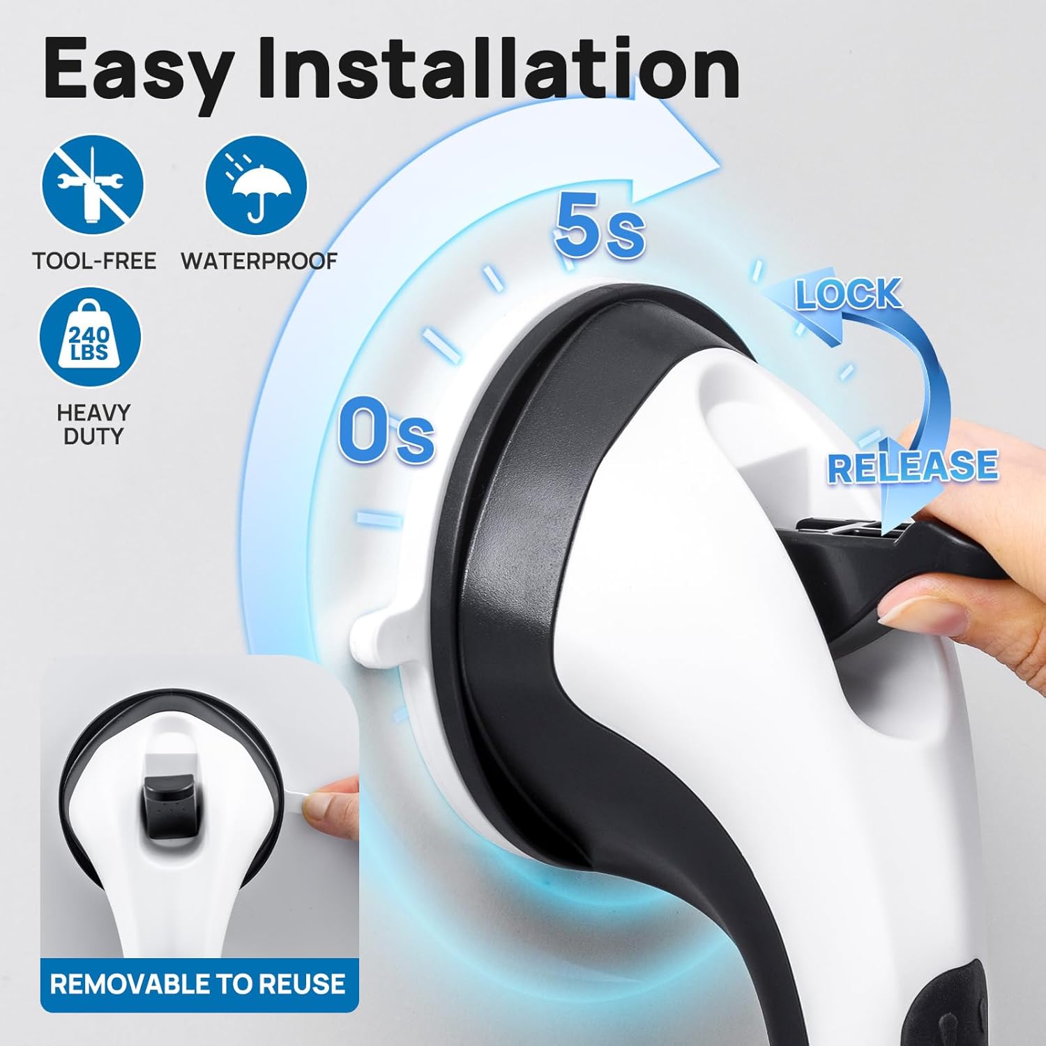 - Easy Installation: Considering how inconvenient it could be to waste long time on installation. LEVERLOC Shower Handle needs No drilling, no glue, no nails, no tool! Just clean the wall, press the suction grab bar on the wall for 5 seconds and lock latches then it’s done! Not only it’s quick and easy installation, but also removable and reusable. Release the latches to remove it then easily clean it with water, and you can reinstall it again.(Press suction for 5 seconds BEFORE locking latches)
