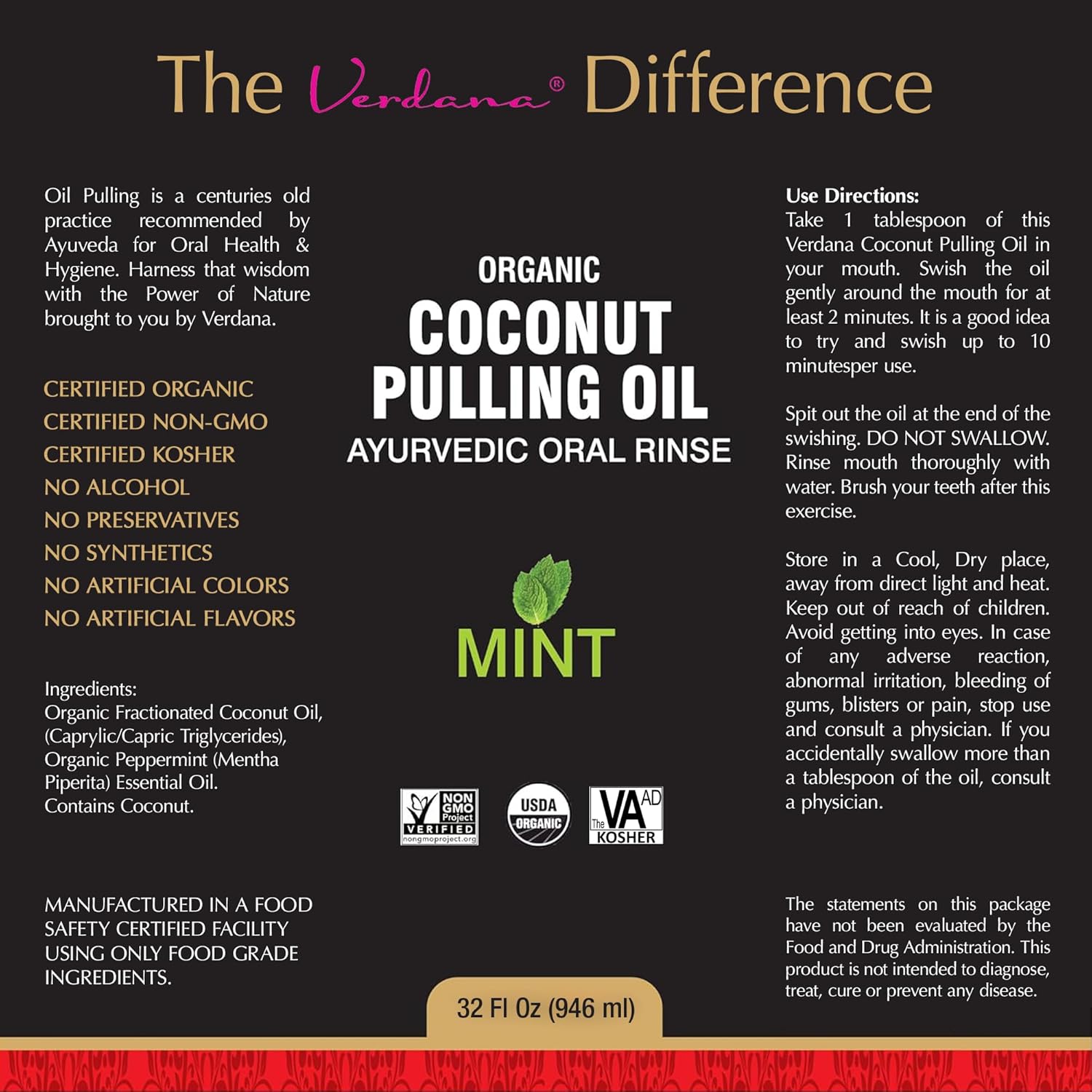 Verdana Organic Oil Pulling for Teeth & Gums – 32 oz Mint – USDA Organic Coconut Pulling Oil Rinse – Alcohol-Free, Fluoride-Free – Natural Mouthwash for Fresh Breath, Gum Health & Oral Detox