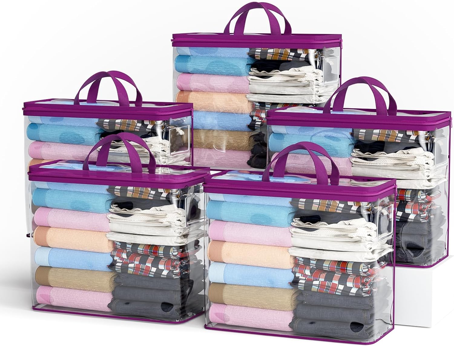 5PACK Clear Zippered Storage Bags for Clothes, 22L Closet Organizers Bag, and Blanket Storage Bags for Bedding, Linen, Blankets, Comforters, Clothing & Toys (Purple)