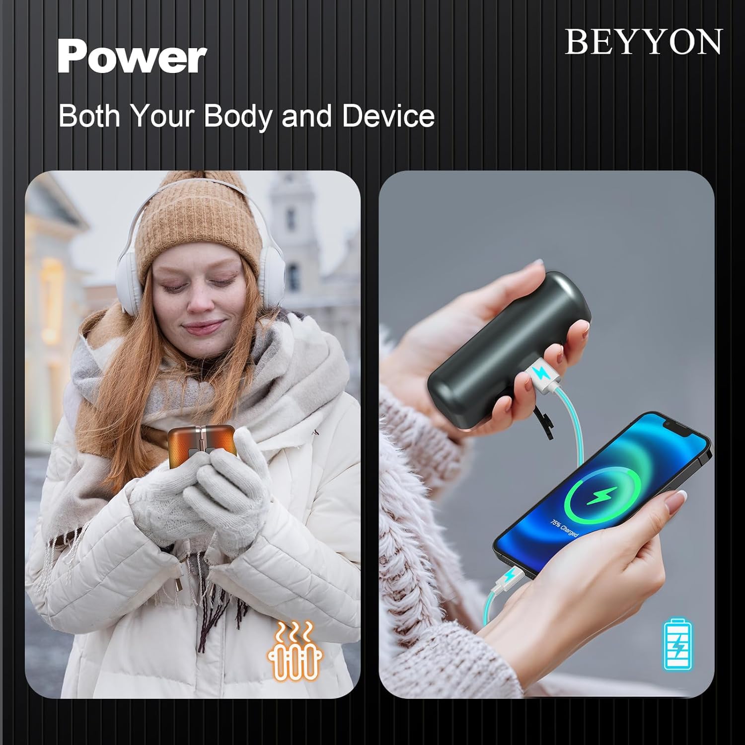 - 【Extended Battery Life, Portable Power Bank】-BEYYON hand warmers come with 10,000mAh high-capacity battery, providing you all day outdoor warmth. Each hand warmer can also function as a portable power bank to charge your phone, earbuds, and other devices. Juice both you and your devices up on the go!