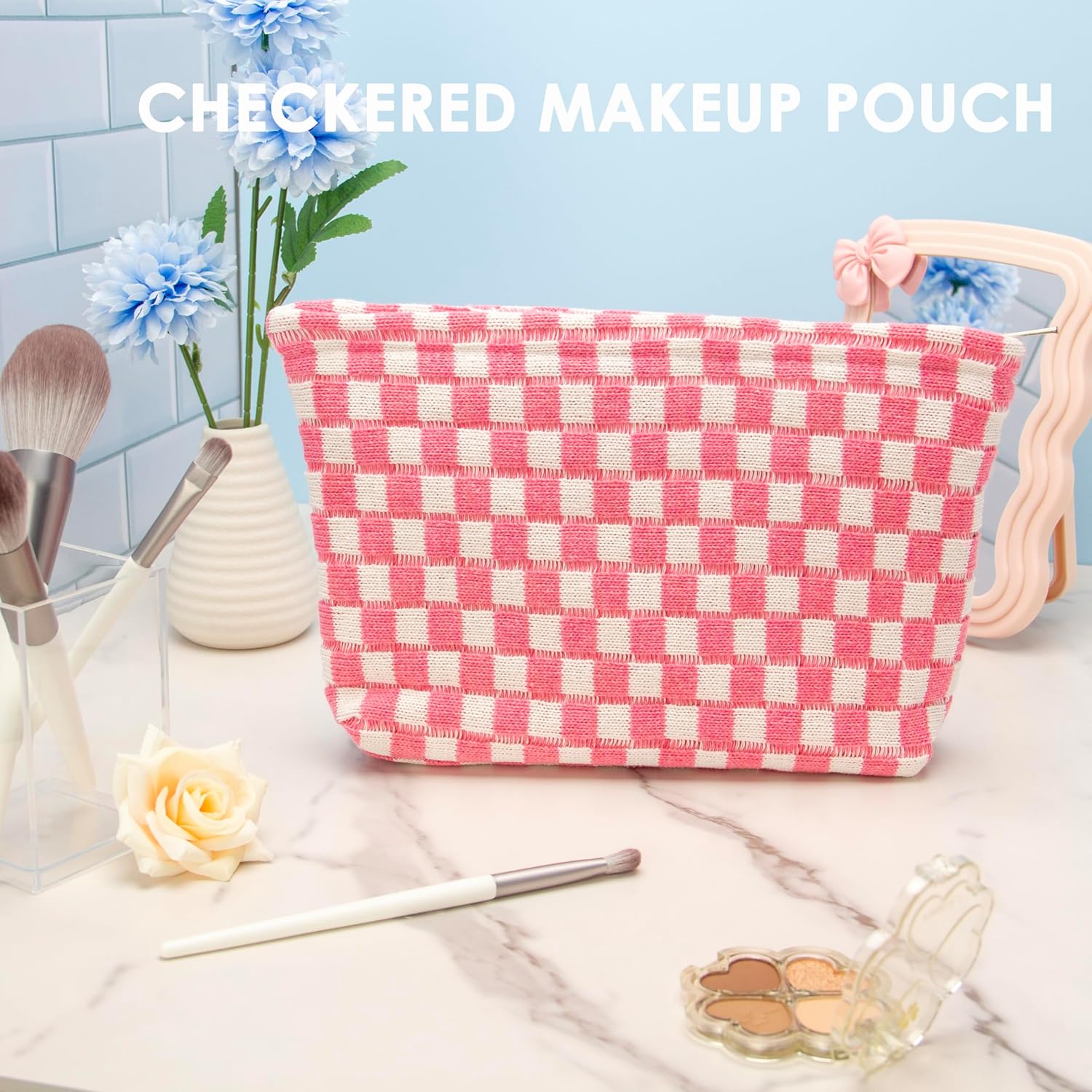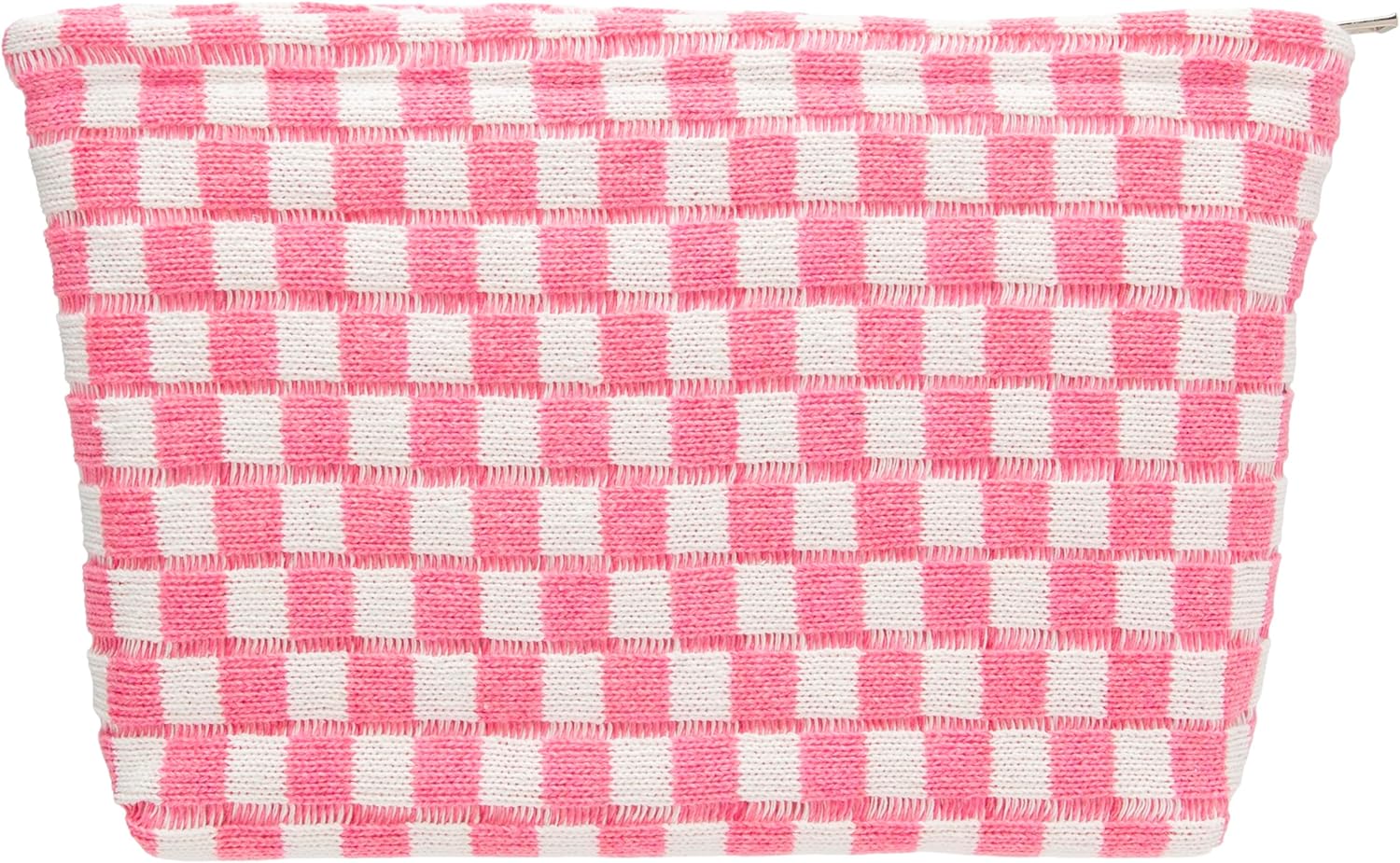 Knitted Checkered Makeup Bag Large Zipper Make Up Accessory Pouch for Purse Cosmetic Brush Bag for Travel Essential Pink White