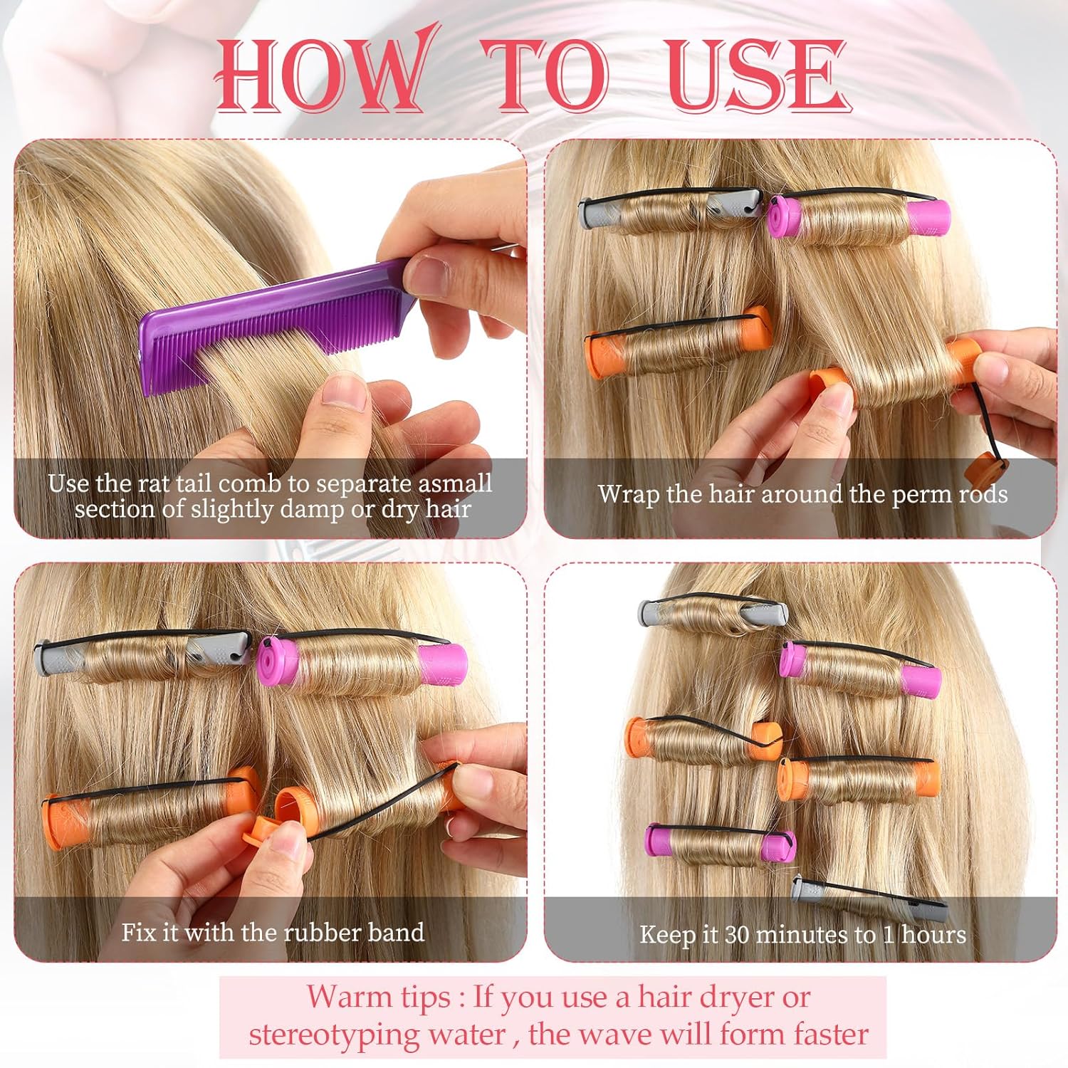 - Steps to Apply: you need to use the pintail comb to separate a small strand of slightly damp or dry hair, wrap it on the rods, then use the rubber band to fix it, no need heating, so it won't hurt your hair, wait for a while and you can get a curly hair