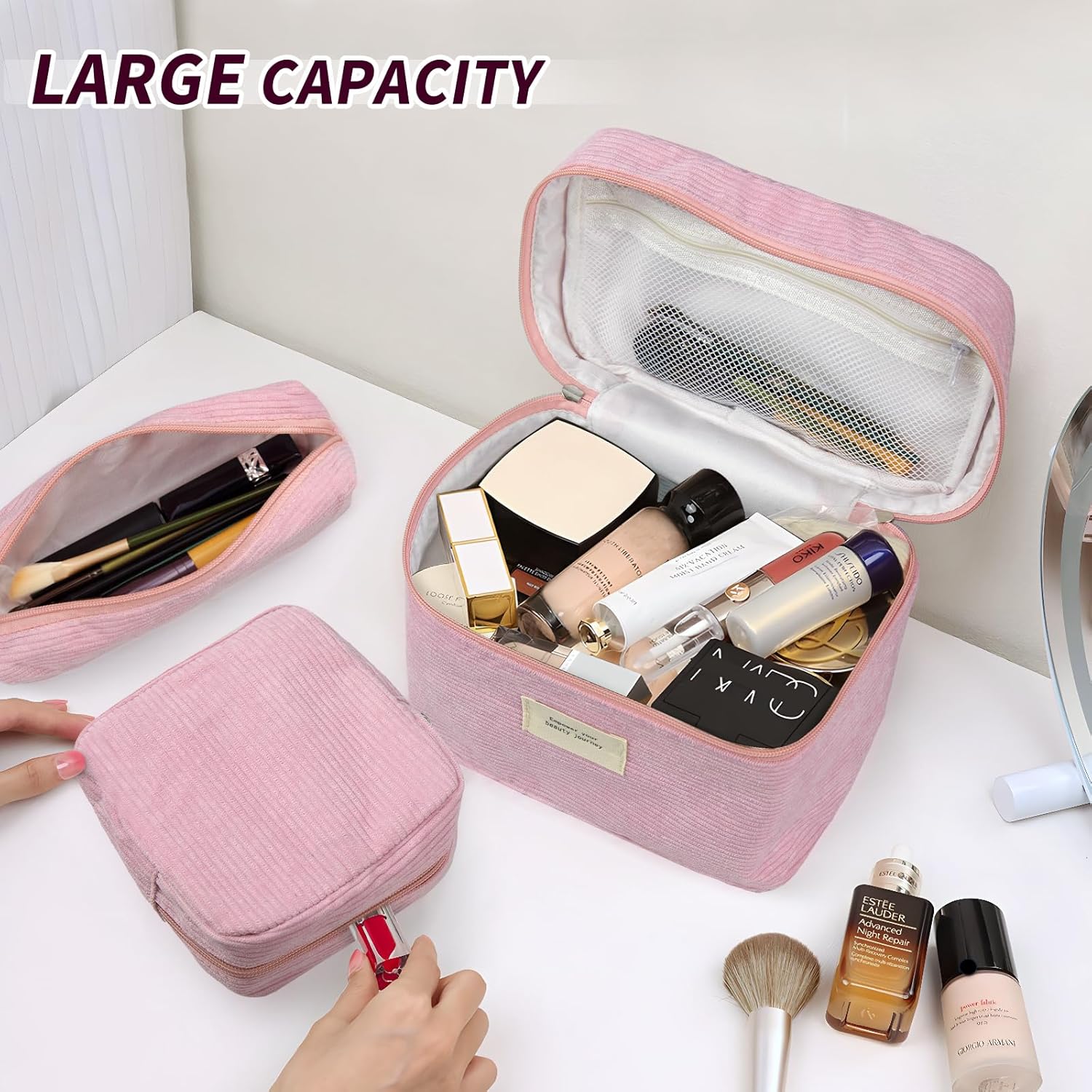 - Our corduroy makeup bags serve both as makeup organizers and storage pouches. They effortlessly hold daily makeup items, skincare samples, and even your phone. The smaller makeup bag can also be used as a stylish wallet. Lightweight and compact, these makeup bags are travel-friendly and easily fit into your suitcase.