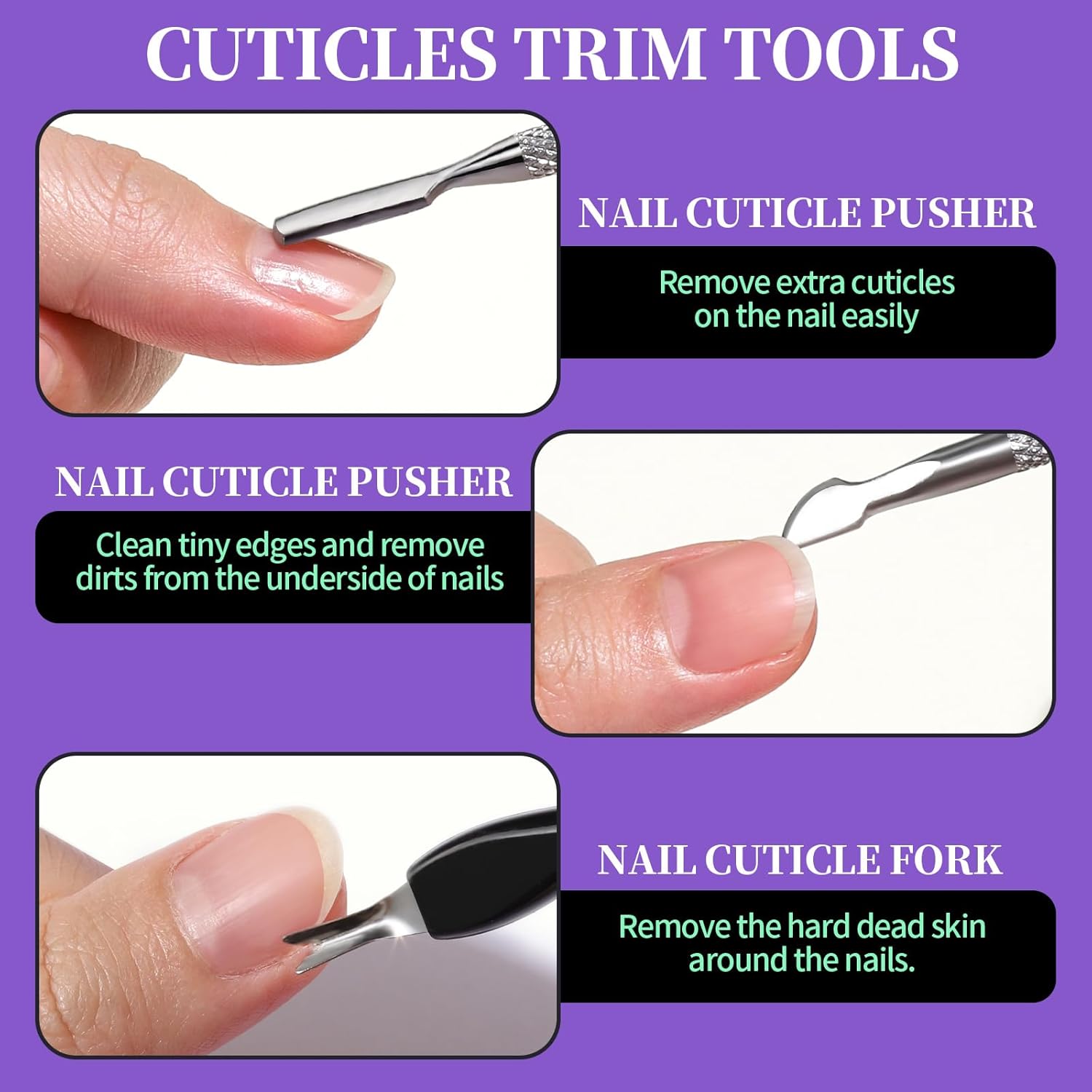 - Cuticle Trimmer & Cuticle Pusher & Cuticle Fork: The triangular side of nail cuticle pusher is very suitable for removing residue and dirt under nails. The spoon-shaped side used for pushing the cuticles together. It is also the best helper for removing the nail gel or polish residue. The curved head cutter of the nail nipper can cleanly and evenly cut the cuticle to ensure that the dead skin and cuticle easily removed. The cuticle fork can remove the hard dead skin around the nails.