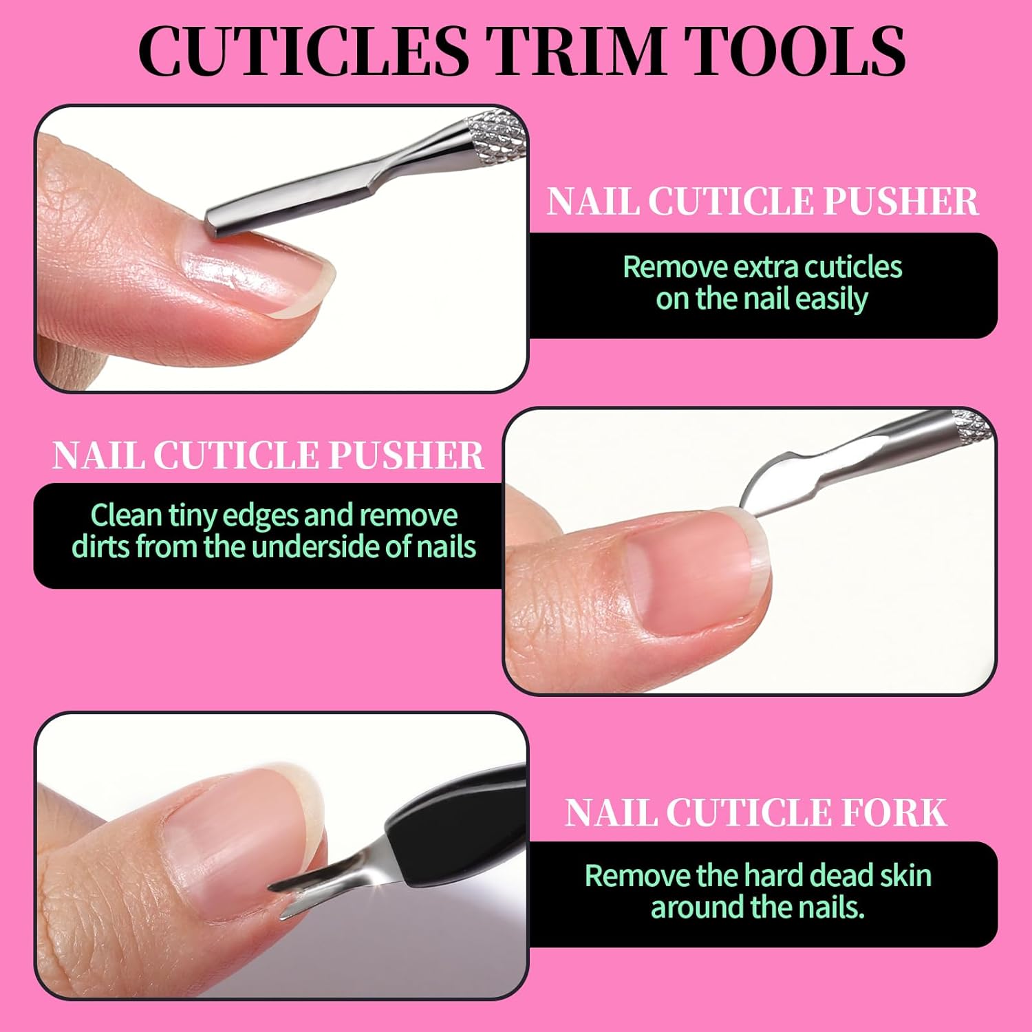 - Cuticle Trimmer & Cuticle Pusher & Cuticle Fork: The triangular side of nail cuticle pusher is very suitable for removing residue and dirt under nails. The spoon-shaped side used for pushing the cuticles together. It is also the best helper for removing the nail gel or polish residue. The curved head cutter of the nail nipper can cleanly and evenly cut the cuticle to ensure that the dead skin and cuticle easily removed. The cuticle fork can remove the hard dead skin around the nails.