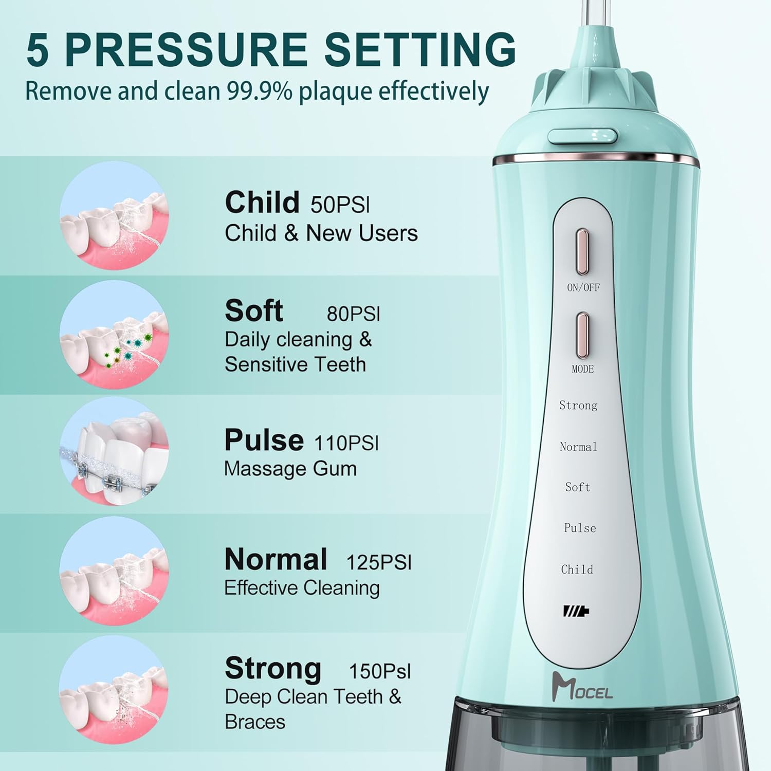- 【5 Different Modes & Newest Design for Family】 Are you looking for a good dental water flosser for your multiple family members? Mocel portable cordless tooth pick has 5 cleaning modes and 6 nozzles: Strong, normal, soft, pulse and child for family members. Removing up to 99.9% plaque from dental areas for improving gum health. The soft mode and child mold work perfectly for child and sensitive gums. The design looks elegant and it owns small waist shape which can be hold tightly.