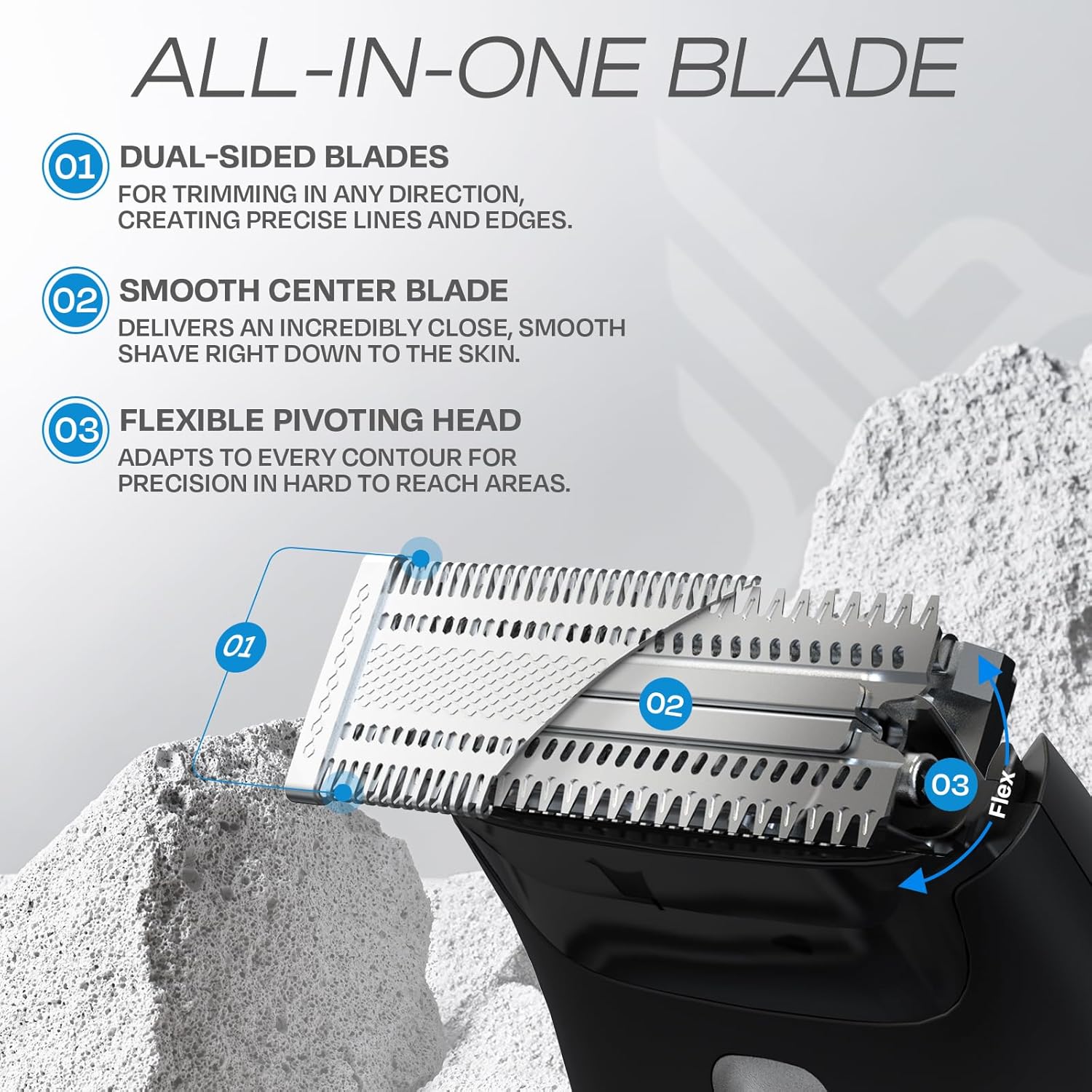 - MULTI DIRECTIONAL BLADE – Easily trim and shave, even the most difficult-to-reach areas thanks to the pivoting flex head. The slim shape is optimal for trimming hard-to-reach areas such as the groin area. Create precise edges thanks to the dual-sided blade that trims in any direction. Go smooth right down the skin safely with the center cut blade for unmatched closeness and skin comfort.