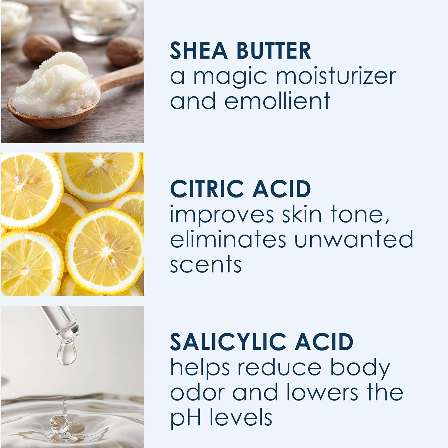 - Natural ingredients: such as coconut oil, aloe vera & salicylic acid offer lasting odor control while keeping the skin hydrated, soft and soothed. Cruelty-Free, Talc-Free, Aluminum-Free, Paraben-Free, Phthalate-Free, Baking Soda-Free.