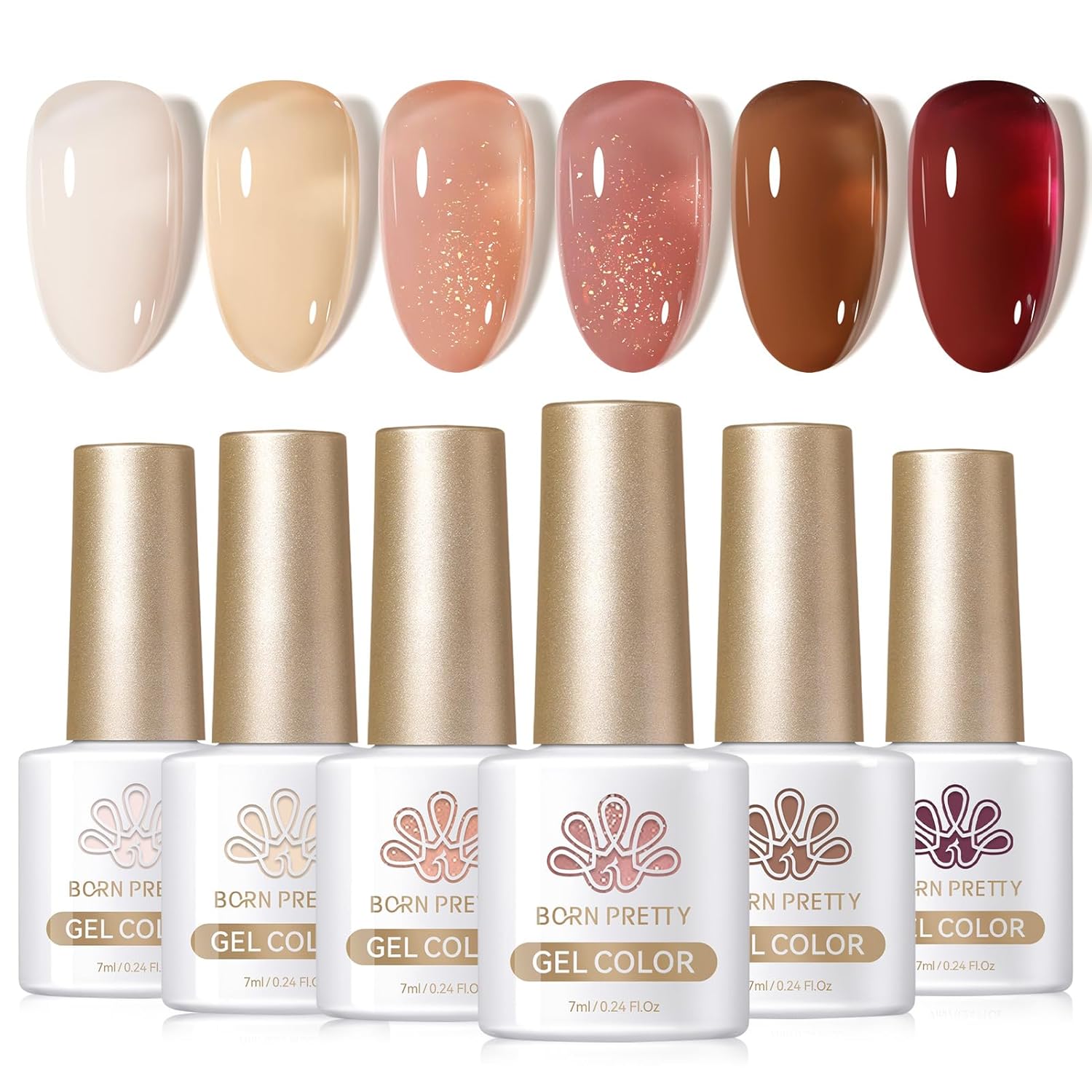 Born Pretty Jelly Gel Nail Polish Fall Winter Brown Nude Dark Wine Red Sheer Gel Nail Polish, Crystal Transparent Gel Polish Nail Art Manicure DIY Salon and Home 7ML 6PCS